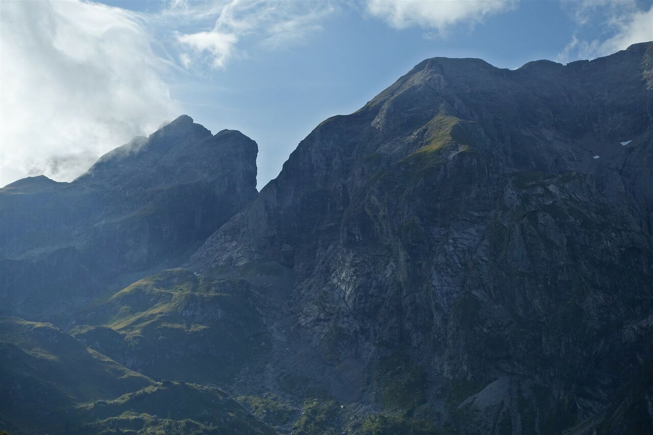 Wir erreichen die 02 Forcella La Varetta (1.704 m), rechts geht es zu der Casera La Varetta, wir gehen aber links Richtung Forcella del Marmol. Wir wandern auf einem extrem steil abfallenden, mit Gras bewachsenen Berghang. Unterhalb sieht man das Rifugio Furio Bianchet, direkt vor uns erhebt sich der mächtige Felskloß des 2.565 m hohen Schiara.