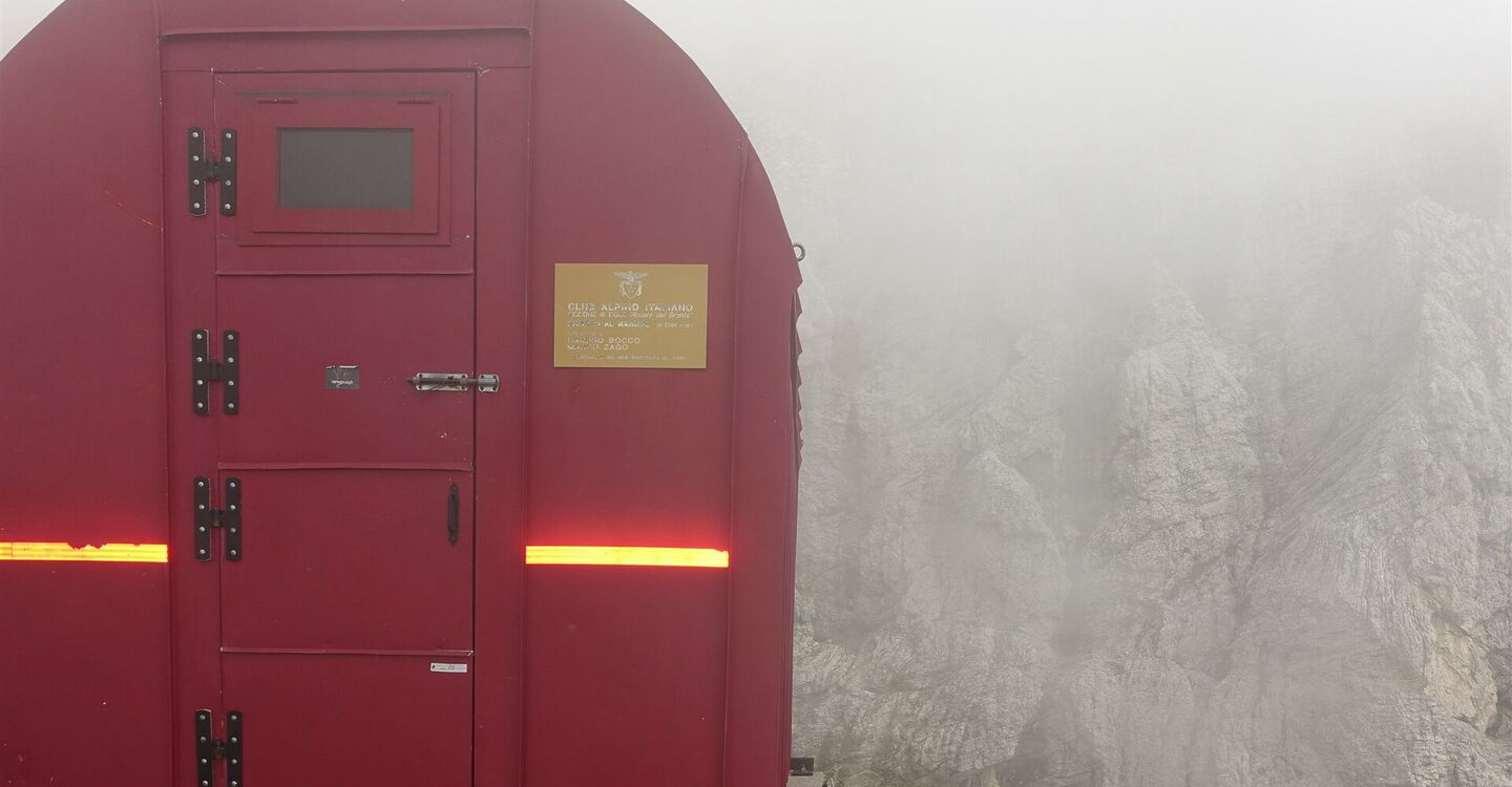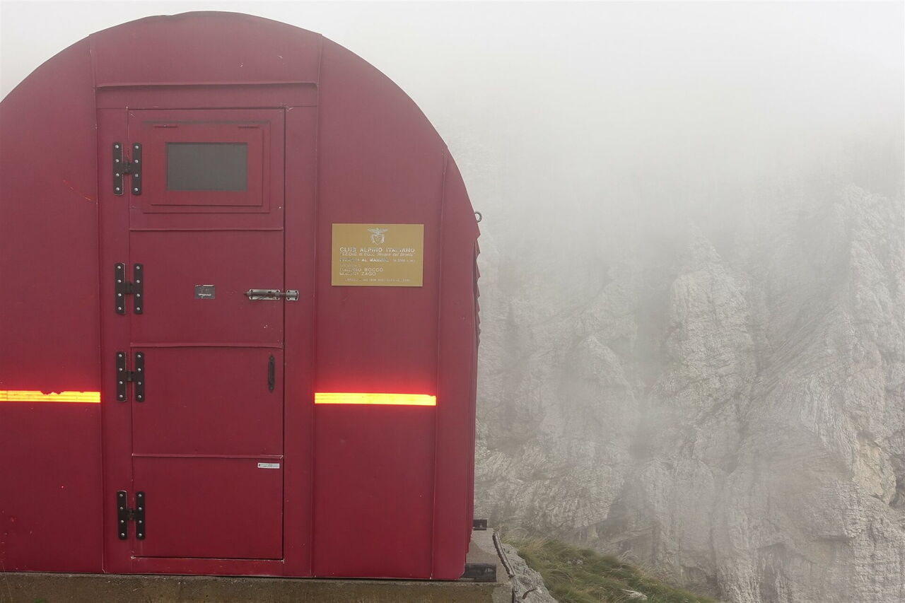 Von nun an wird das Klettersteigset angelegt, um durch die Ostwand des Schiaras aufzusteigen. Es geht über einen gesicherten Klettersteig/Felsstufen und Schrofengelände. Bei ca. 2.360 Höhenmetern erreichen wir den Scheitelpunkt der heutigen Etappe, rechts zweigt der Aufstieg zum Gipfel des Schiaras ab. Für den Abstecher über den zunächst noch breiten Rücken und den nachfolgenden Nordostgrat (Schwierigkeitsgrad I) benötigt man ca. 1¼ Stunden. Nach weiterem Abstieg entlang einer breiten Felsspalte erreichen wir das knallrote 05 Bivacco del Màrmol (2.266 m).