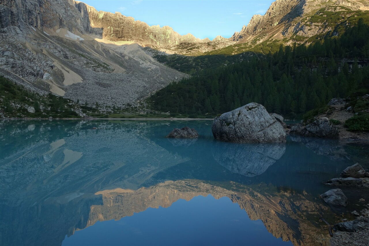 Bereits nach wenigen Minuten erreichen wir den 02 Lago del Sorapiss (1.894 m). Da Fotos vom Lago del Sorapiss bei Instagram sehr viele Likes bekommen haben, ist er im Ranking sehr weit oben. Die Folge: Das Rifugio Vandelli verkauft täglich bis zu 5.000 Essen und Carabinieri patrouillieren am See, um zu verhindern, dass die Besuchermassen Müll hinterlassen oder gar im eiskalten See ein Bad nehmen. Hinter dem See erhebt sich imposant die 2.603 m hohe Felsnadel Dito di Dio, was ins Deutsche übersetzt heißt "Finger Gottes". Wir gehen an der rechten Seite des Sees entlang, um an dessen Ende auf den Überresten einer Gletschermoräne und im oberen Abschnitt in einer steilen Geröllrinne aufzusteigen. Links oberhalb (in südlicher Richtung) sehen wir die spärlichen Überreste des Sorapissgletschers (Ghiacciaio Occidental). An dieser Stelle gehen wir halb rechts um einen Felssporn herum, um dann über von Gletschern platt geschliffene Felsen in das Hochkar Tonde de Sorapiss abzusteigen.