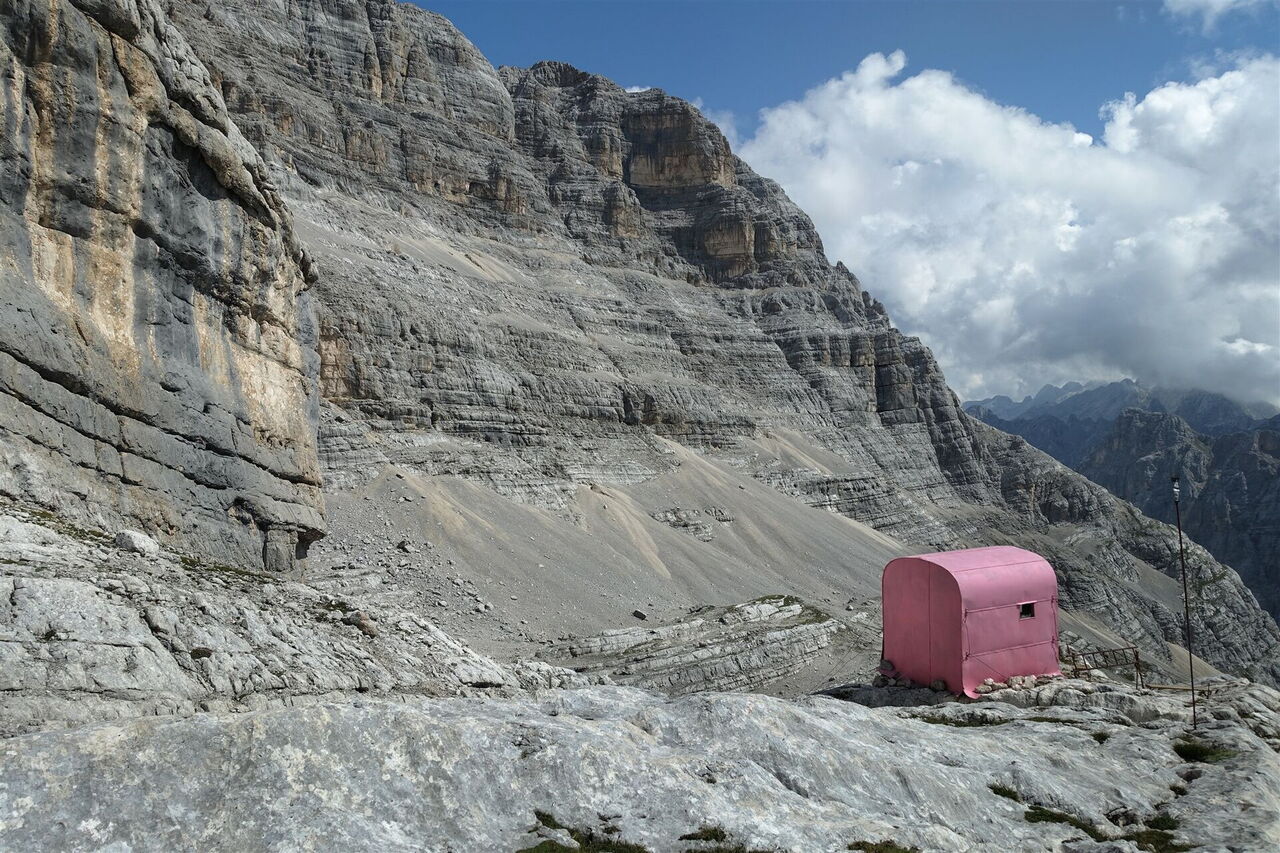 Zum krönenden Abschluss geht es dann auf einem sehr schmalen Felsband inmitten einer senkrecht abfallenden Felswand – zum Glück an einem durchlaufenden Sicherungsseil – bis zur Forcella del Bivacco hoch, dem höchsten Punkt der heutigen Etappe. Von dort geht es auf dem Wanderweg 246 nur noch wenige Meter bergab bis zum 05 Bivacco Slataper (2.600 m).