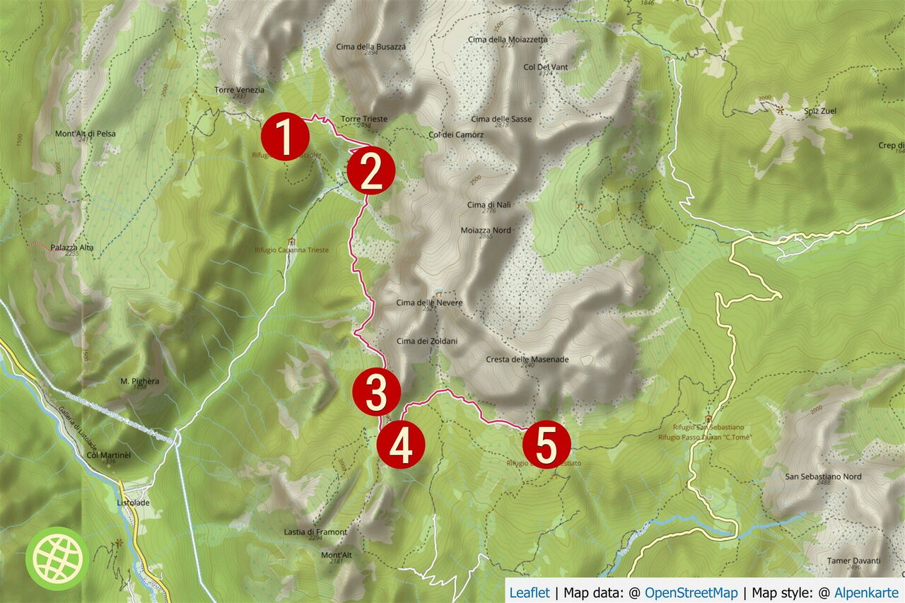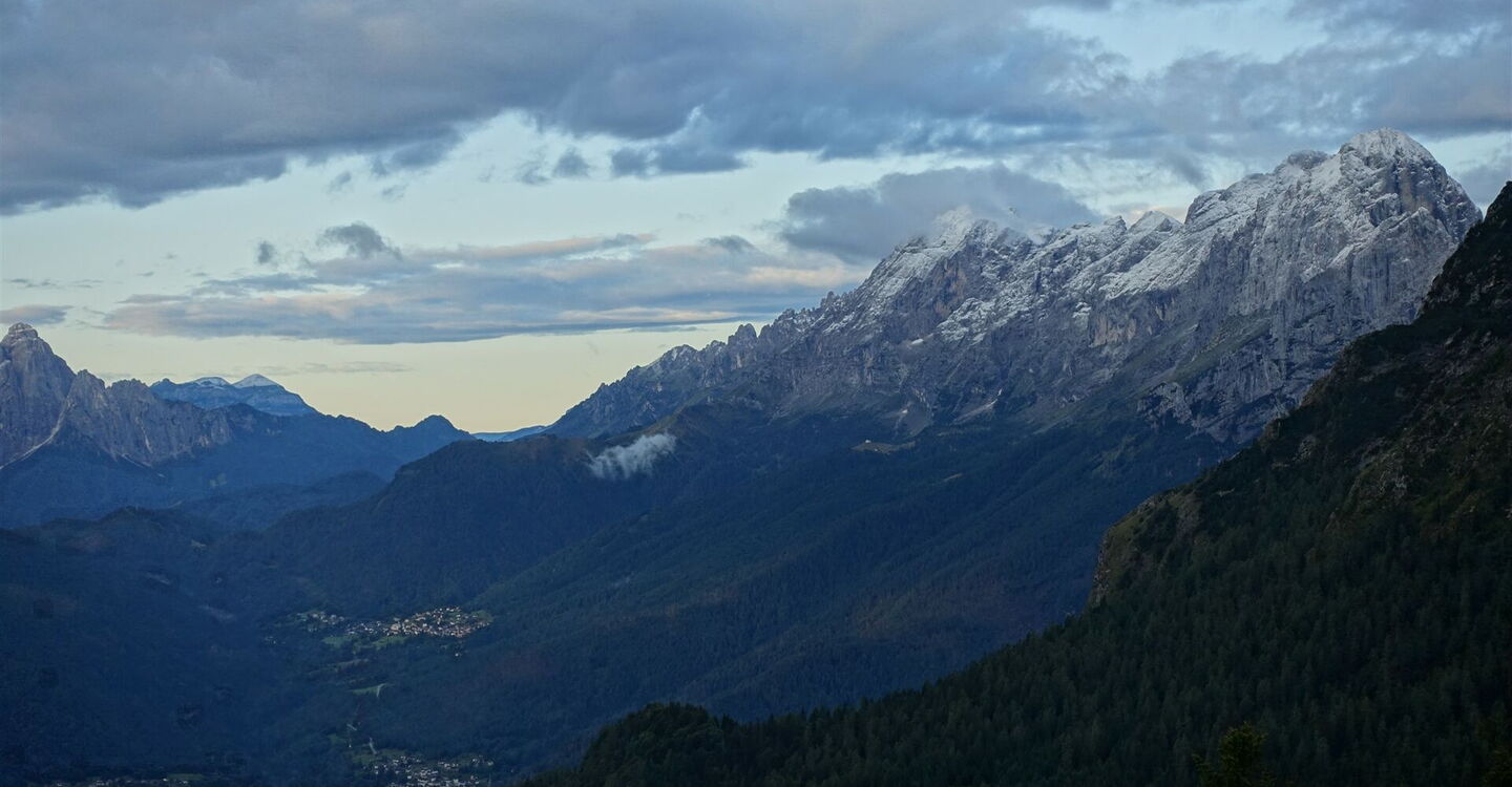 Das Civetta-Bergmassiv bildet gemeinsam mit den kleineren Gipfeln der Moiazza-Untergruppe die Civetta-Moiazza-Gruppe. Der höchste Punkt der Moiazza ist die 2.878 m hohe Cima Moiazza. Diese touristisch noch wenig erschlossene Region überzeugt durch landschaftliche Schönheit und ihre mit Blumen übersäten Almwiesen. Auf dieser außergewöhnlichen Etappe wandern wir entlang imposanter Felsnadeln wie dem 2.485 m hohen Torre Trieste oder dem 2.083 m hohen Torri del Camp und unterhalb der bis zu 700 m hohen Wandzonen der 2.413 m hohen Pala delle Masenade.