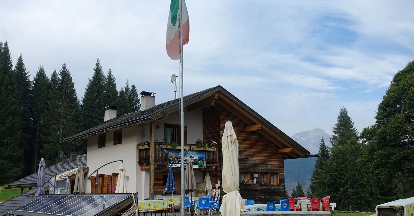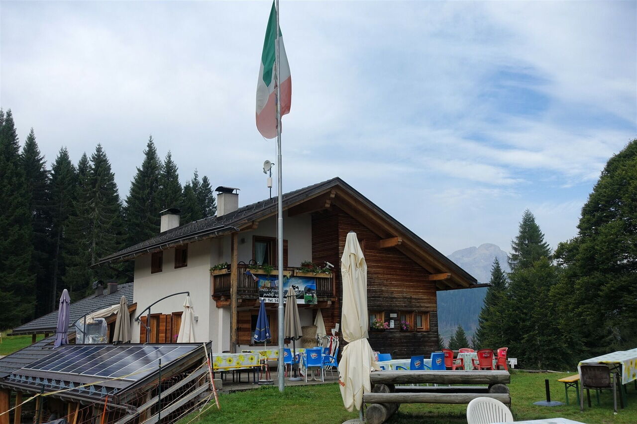 Bei einem Heiligenschrein durchläuft die Piste eine Linkskehre. Rechts führt ein Pfad Richtung Zoppe de Cadore, wir gehen aber auf der Piste weiter und kommen nur kurz später an der Ruine eines Hauses und einem alten Holzhaus vorbei. Bei mehreren Wegweisern folgen wir der bergab führenden Piste durch die scharfe Rechtskehre. Wir befinden uns nun ein kurzes Stück auf dem Wanderweg 493. Anschließend erreichen wir eine Straße mit einer Parkbucht, an der wir scharf links gehen, nun auf dem Wanderweg 456 Richtung Rifugio Talamini. Ca. 1,45 km bleiben wir nun auf dieser Straße – teils Piste –, bis wir den Wegpunkt 02 Sentiero (1.599 m) erreichen. Hier mündet von links die Tour 65 in unseren weiteren Weg.