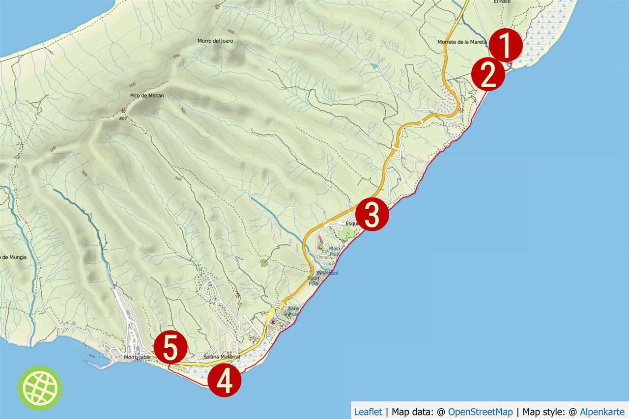 Einfache Wanderung am Strand und mit dem Taxi zurück. Es gibt keine Busverbindung nach Risco del Paso. Art des Weges: 100 % Sandweg. Weitere Ausrüstungsempfehlungen: keine. Einkehrmöglichkeit: Es gibt verschiedene Bars am Strandweg. Beste Wanderzeit: ganzjährig. Variante: Man kann die Wanderung auch beim Hotel Sol Gorriones beginnen. Damit verlängert sich die Strecke um 3,8 km, aber man kann dafür mit der Buslinie 5 zurückfahren.