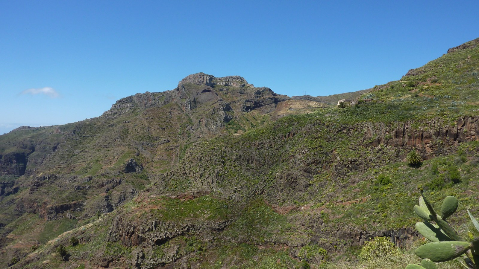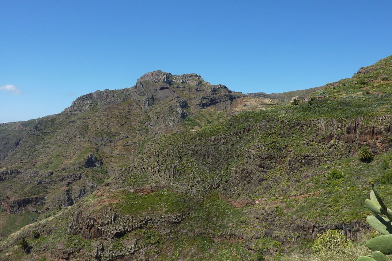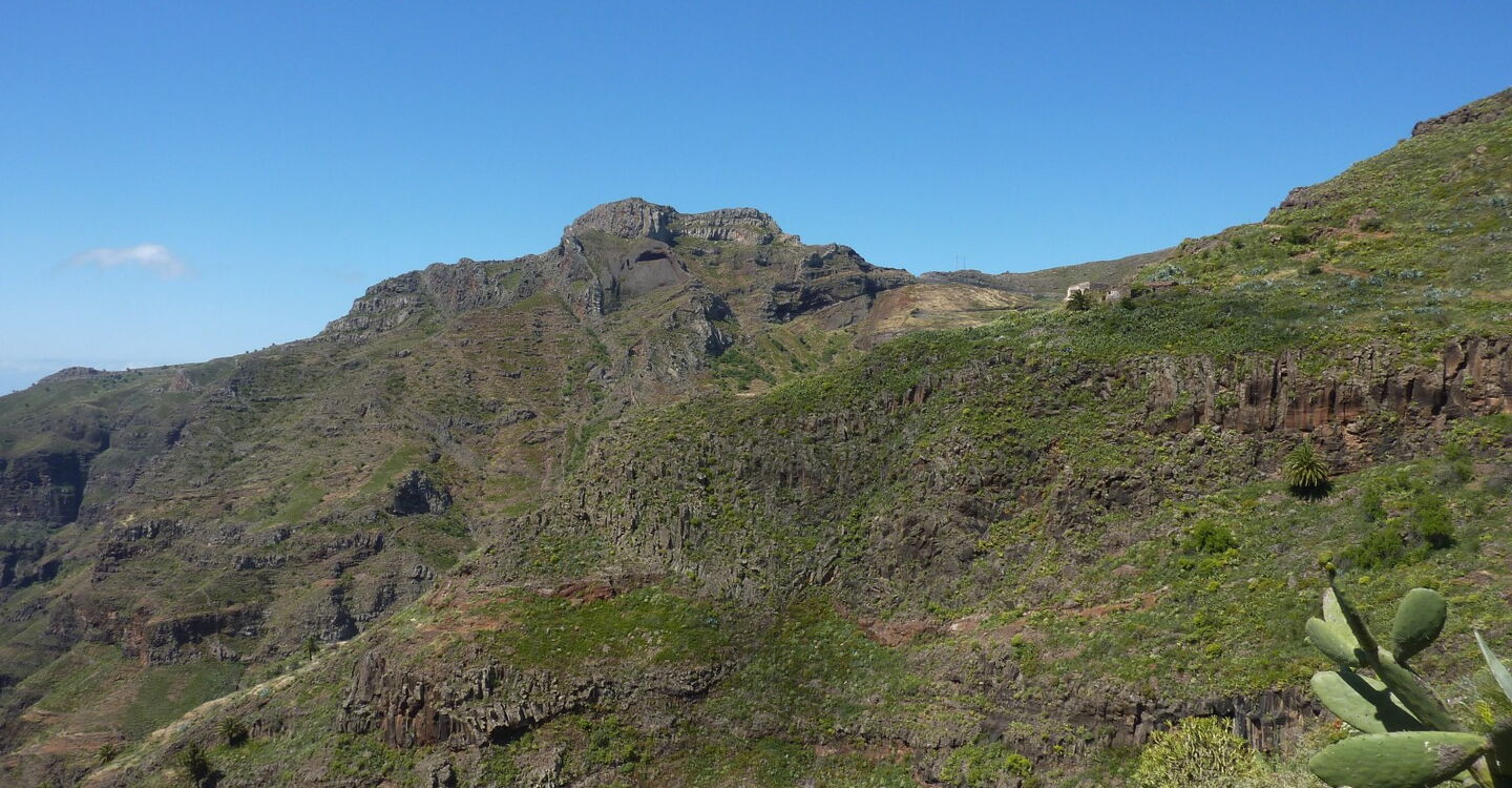 Bei einer Anhöhe erreichen wir Ruinen und nach weiteren 400 Metern beginnt ein steiler Anstieg. Nachdem wir den Bergrücken überschritten haben, gehen wir bei den Ruinen Azadoe rechts und lassen den linken Abzweiger Richtung Playa de Santiago liegen. Nach weiteren 350 Metern erreichen wir den (03) Imada Abzweiger eins (861 m). Hier verlassen wir den Hauptweg und gehen rechts bergauf. Im weiteren Verlauf kommen wir durch ein liebliches Seitental mit seinem Barranco de Izador.