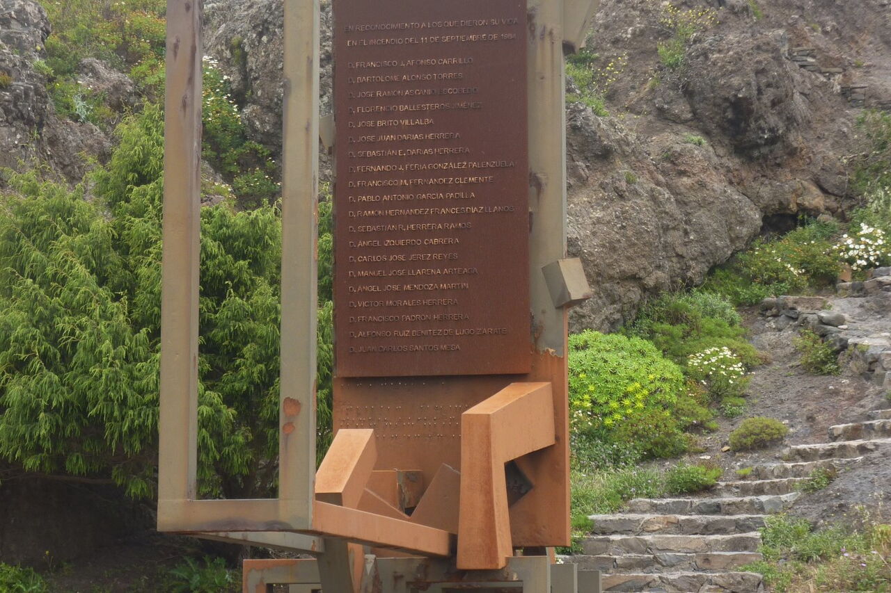 Vom (01) Start und Ziel am Roque de Agando (1064 m) queren wir die GM-2 hinüber zum Denkmal für die Verunglückten durch Waldbrände. Wir befinden uns an der Carretera dorsal, der großen Verbindungsstraße zwischen der Hauptstadt und den westlichen Inselteilen. Direkt links neben dem Denkmal sehen wir einen Durchlass in der Begrenzungsmauer zu Straße. Hier beginnt der Wanderweg unterhalb der 220 Meter hohen Westflanke des Roque de Agando.