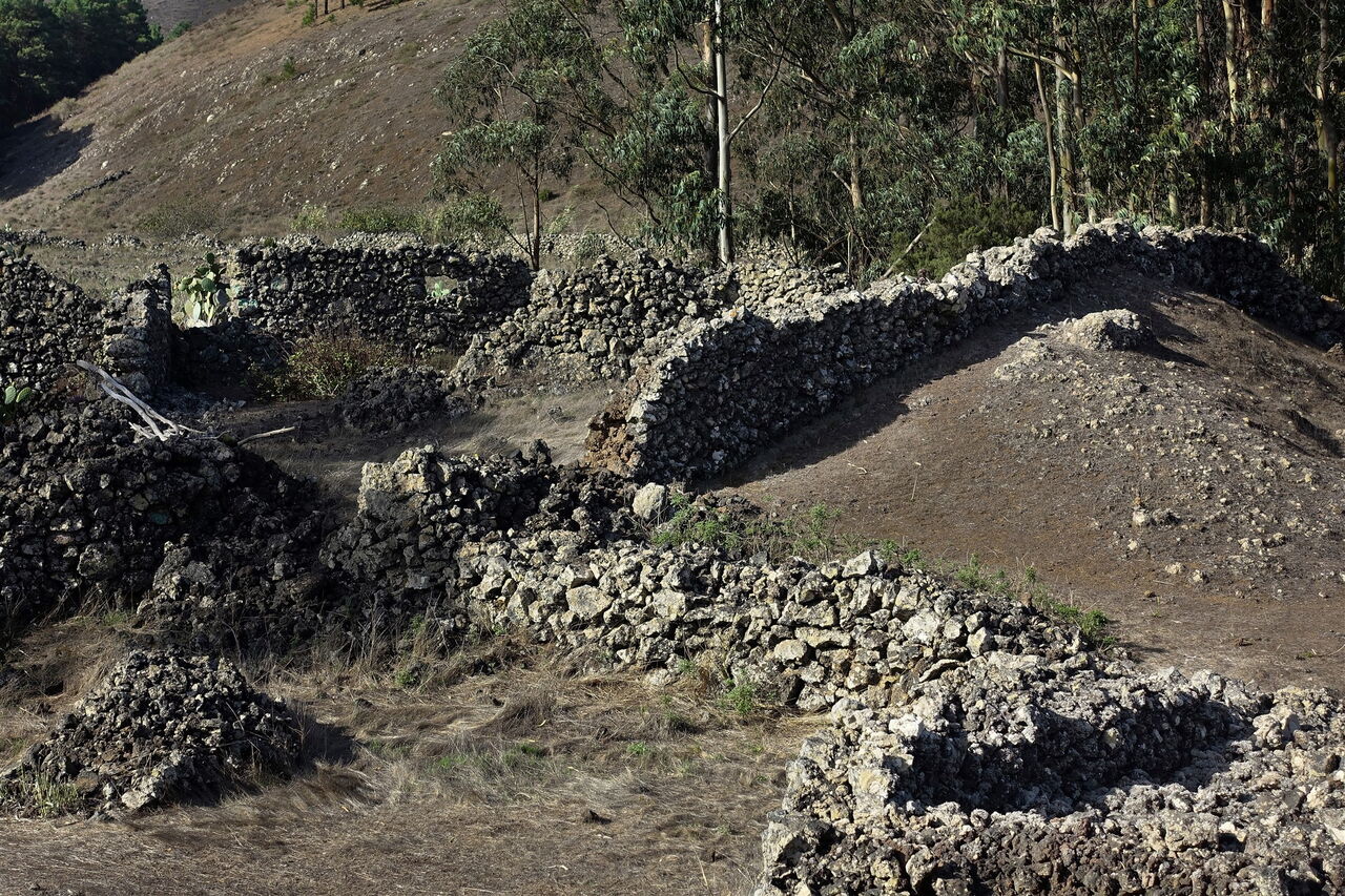 Nachdem wir gut 180° auf dem Kraterrand gelaufen sind, steigen wir bei einer Einbruchstelle des Kraterrands zur tiefer liegenden Piste ab. Es ist kein einfaches Unterfangen, denn auf dem sehr steilen Hang findet man kaum Halt, um abzusteigen. In dem Kapitel Charakter wird eine Variante beschrieben, in der man das Wegstück umlaufen kann. In der Einsattelung zwischen den Vulkankegeln gehen wir bei der Weggabelung halb links an einem kleinen Waldstück vorbei und erreichen eine der ältesten Siedlungen auf El Hierro, (04) La Albarrada (1036 m), die jedoch verlassen ist. Hohe Trockensteinmauern säumen den Weg. Wir gehen bei einer Weggabelung rechts und sofort wieder links und erreichen eine Informationstafel.