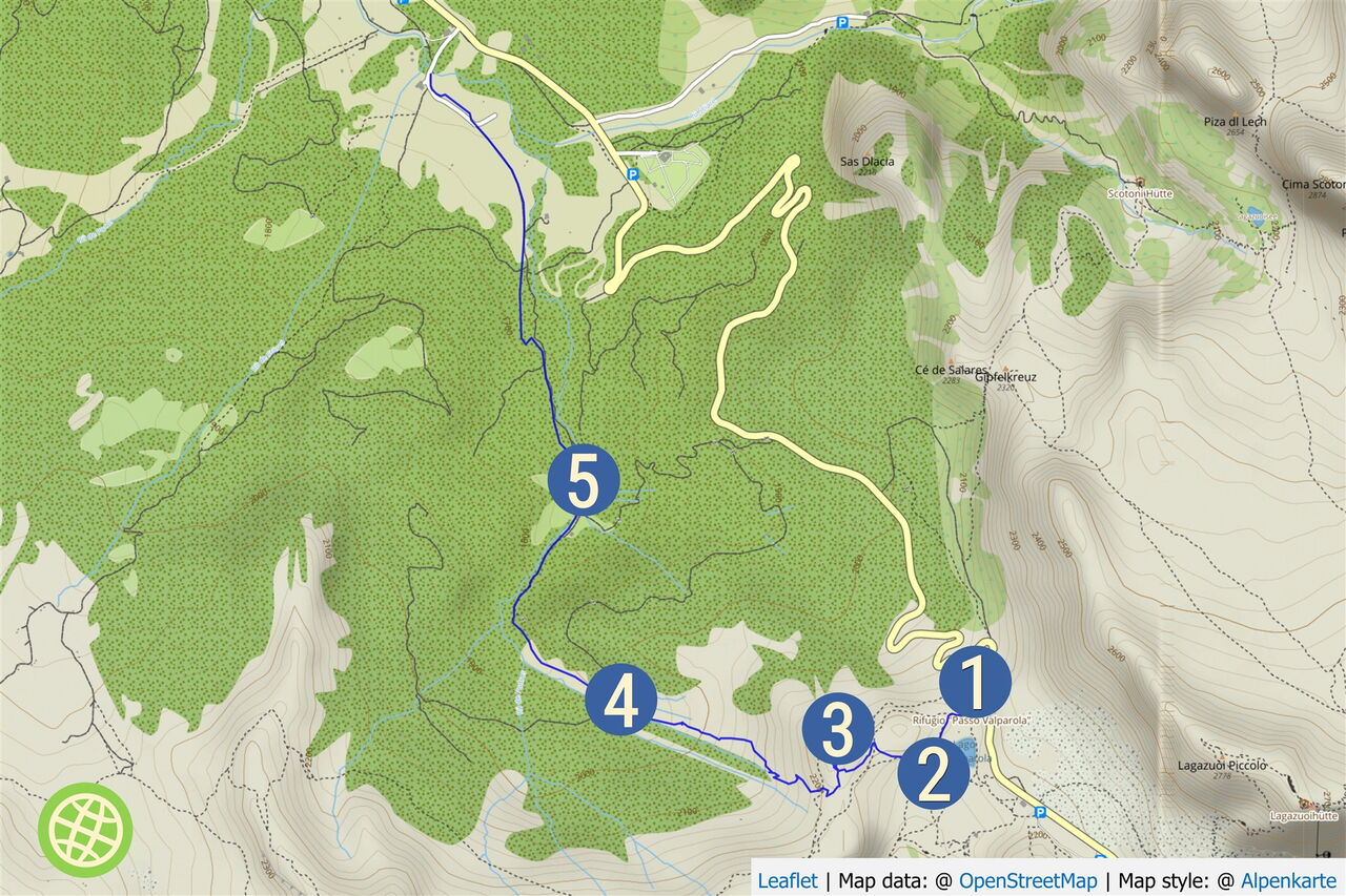 Dann fahren wir rechts vom Flusslauf vorbei an der Malga Valparola auf dem Forstweg aus dem Tal heraus. Am Hotel Gran Ancëi vorbei und nach der Brücke links geht es zum Ausgangspunkt.