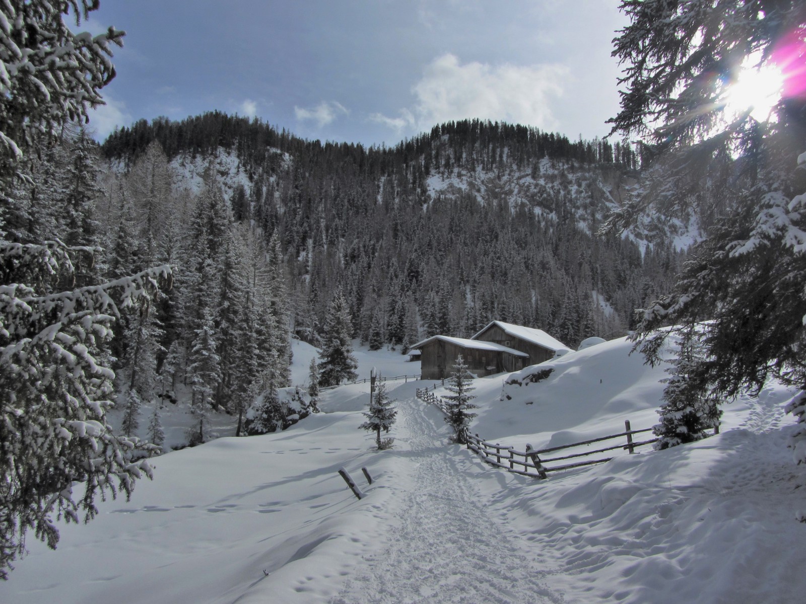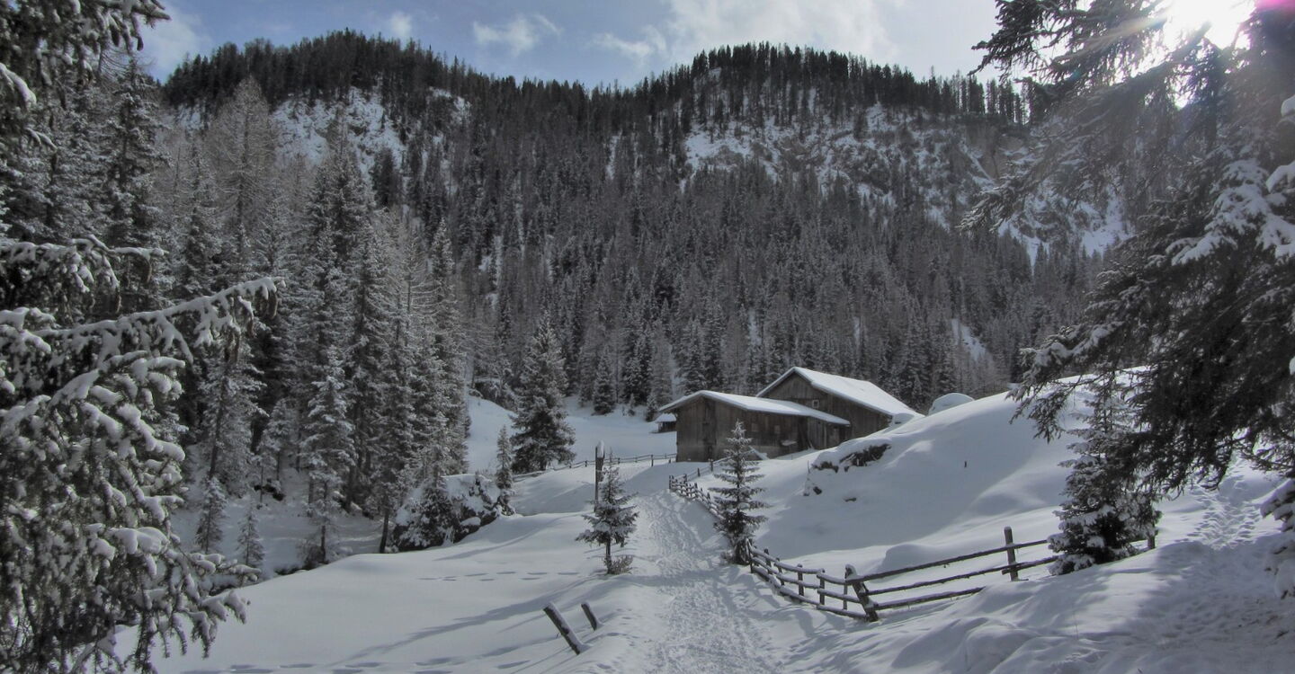 Einfache Orientierung beim Aufstieg. Im Talgrund ist es nicht so einfach, den Weg parallel zum Fluss zu finden. Die Abfahrt führt über einen Nordwesthang. Folgende Ausrüstung wird empfohlen: Produkte für alpine Sicherheit im Schnee, Freerideski und Skitourenhelm. Es empfiehlt sich die Einkehr am Ende der Tour in das Hotel Gran Ancëi. Beste Jahreszeit: Januar bis April. Uns erwarten kurze Stücke mit bis zu 35° Hangneigung.