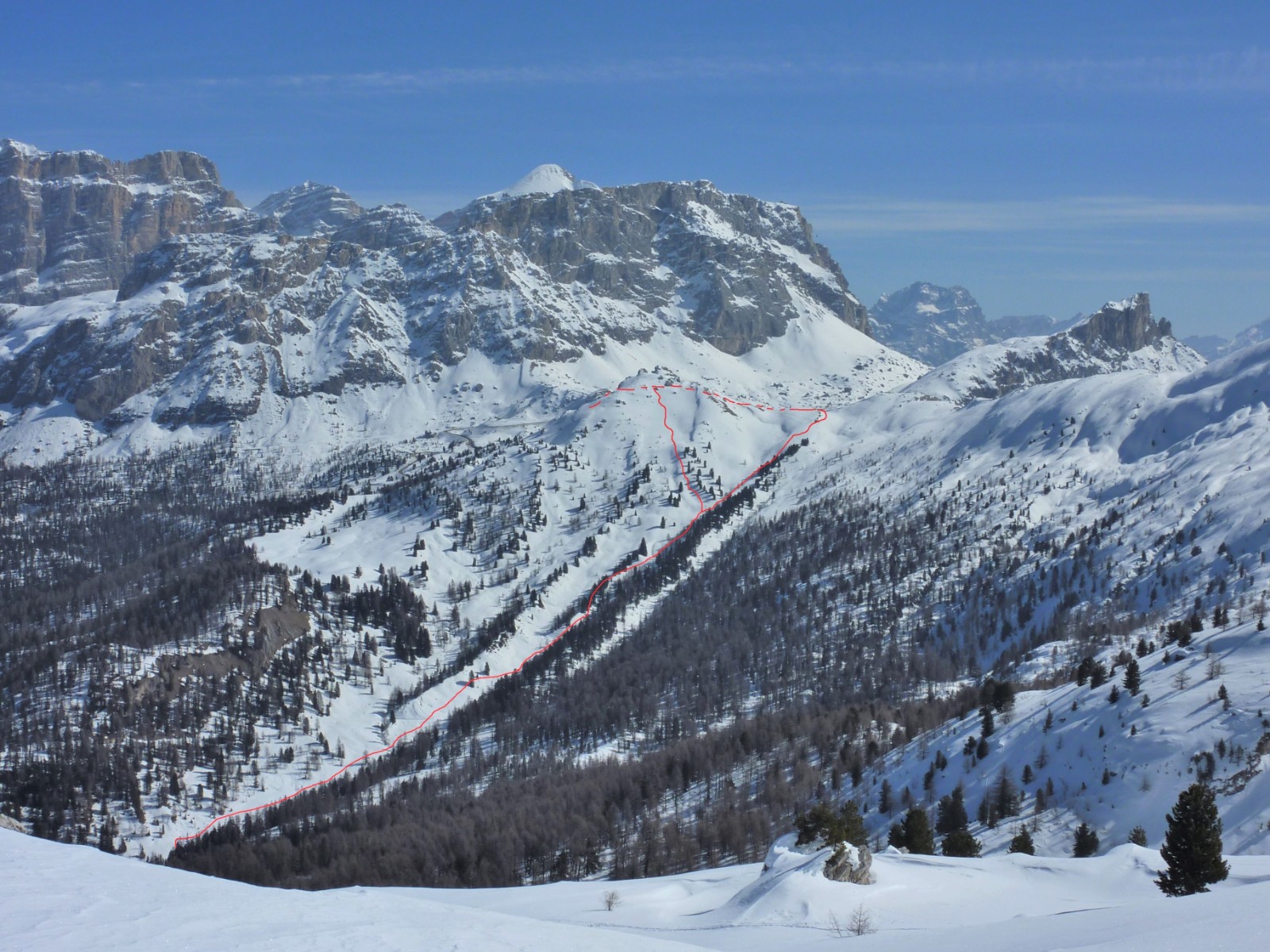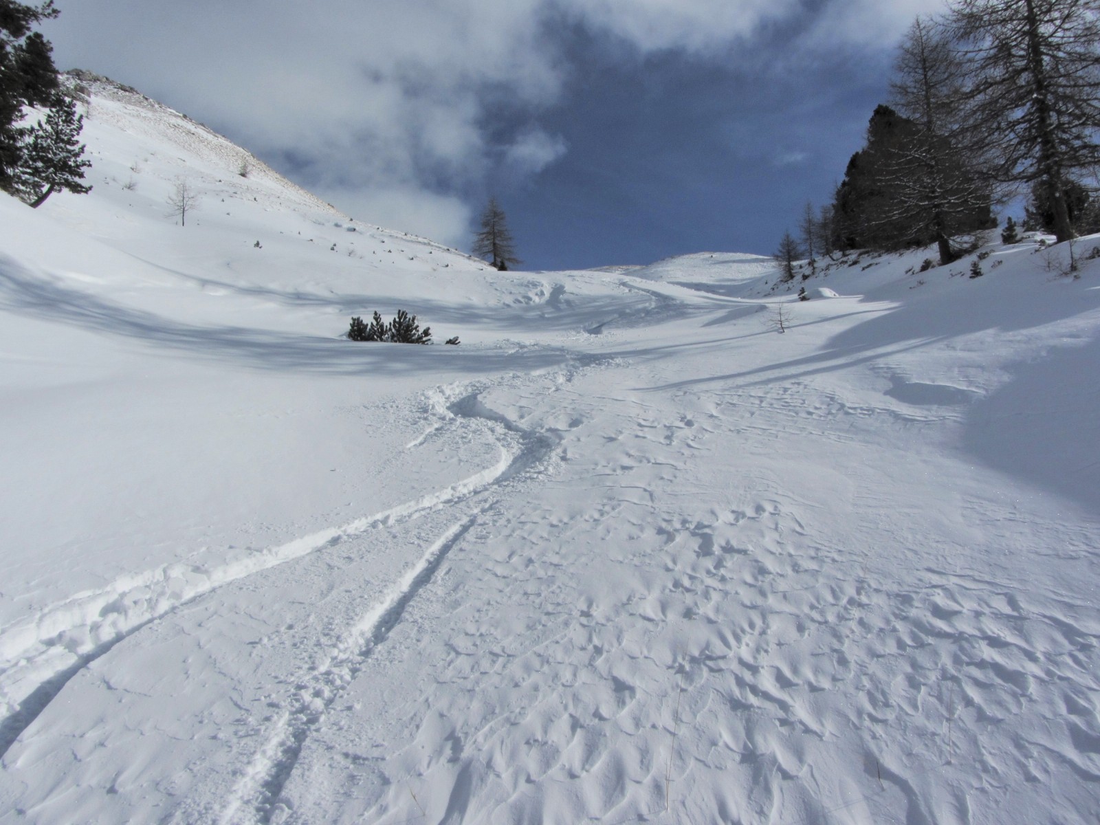 Je nach Schneebedingungen kann man mehrere Varianten nehmen, bis man automatisch in die weiße Rinne der Pra de Ciamena kommt, die bis in den Talgrund führt.