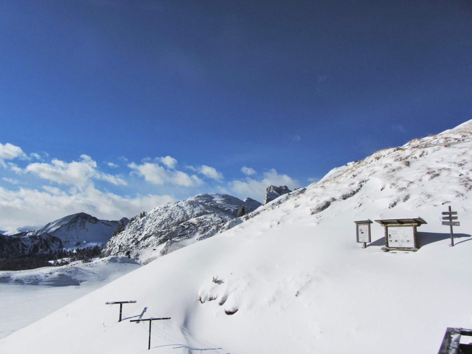 Vor dem Rifugio stehend, gehst du rechts um das Gebäude herum, um dann mit Fellen 1 km und 200 hm bis auf den in westlicher Richtung liegenden Piz Ciampei zu steigen.