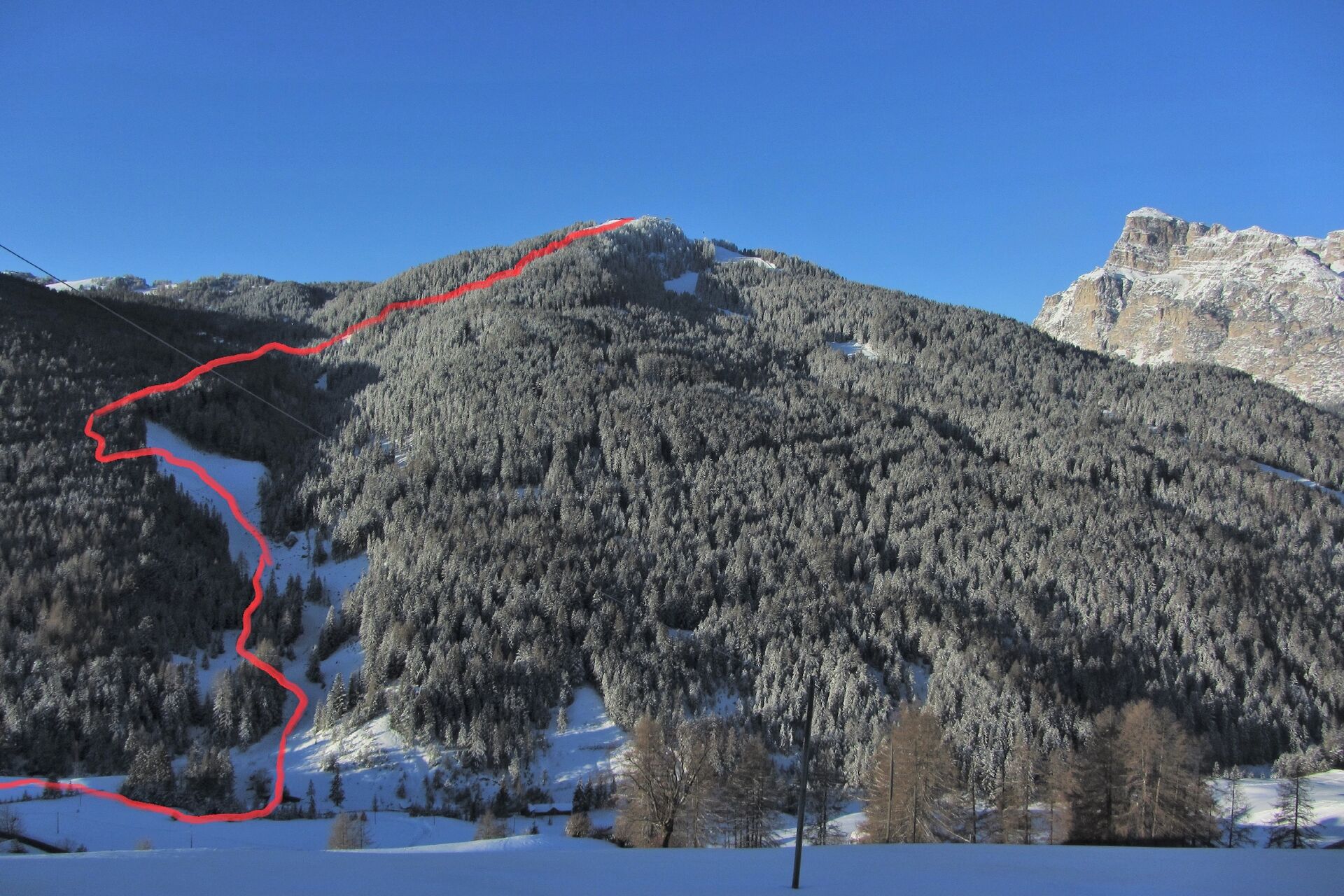 Hier kann man nach La Villa abfahren oder geht 200 m auf der Piste rechts bergauf, um dann links auf dem Wanderweg 2,5 km nach San Cassiano abzufahren. Bis zur Gondel Nr. 11 Piz Sorega kommt nun ein ca. 1 km langer Fußweg.