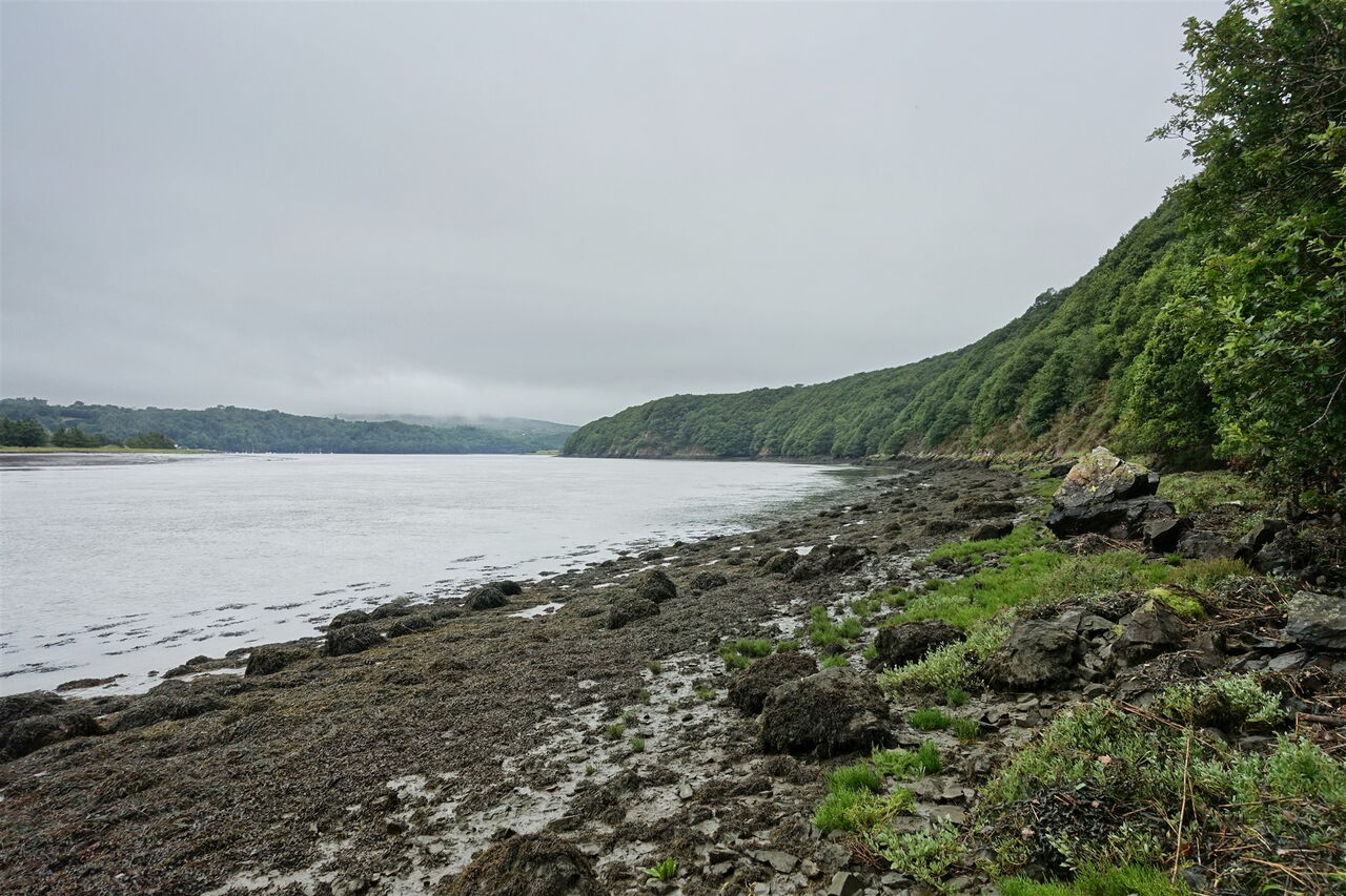 Zum Auftakt der Wanderung erleben wir einen atemberaubenden Blick auf den 140 m tiefer liegenden Fluss Aulne Maritime. Auf der anderen Uferseite liegt das Dorf Trégarvan und dahinter erhebt sich der Vulkanberg Ménez-Hom. Auf der linken Seite, weiter stromaufwärts, befindet sich die Passage de Dinéault, wo bis 1950 eine Fähre verkehrte. Vom 01 Start und Ziel (144 m) gehen wir über den Parkplatz und folgen der Zufahrtsstraße in nördliche Richtung, um hinter dem weißen Gartentor links in die Straße einzubiegen. Die nach links abzweigende Straße ignorieren wir und gehen geradeaus weiter, nun auf der Schotterpiste.