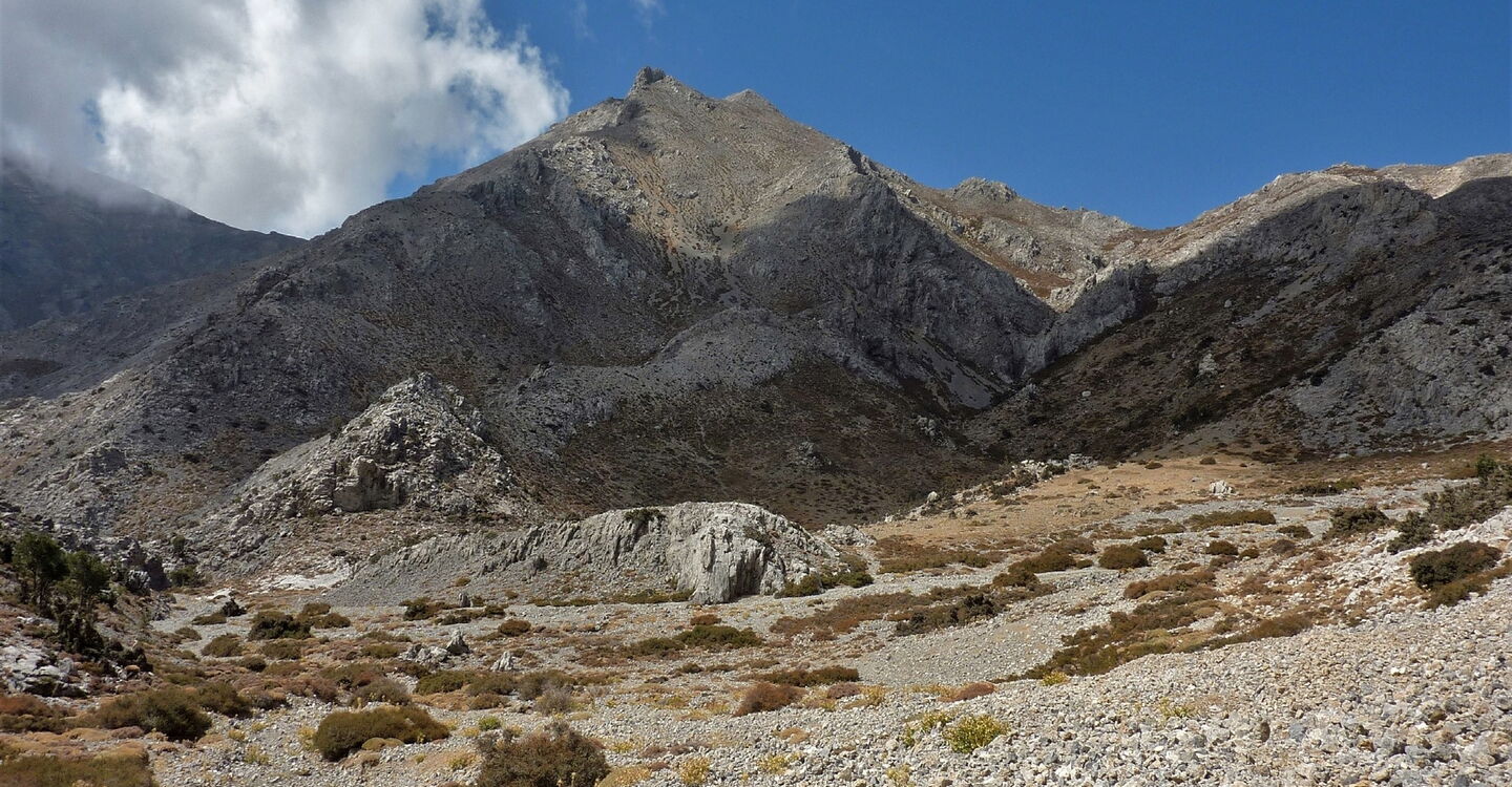Nach kurzem Abstieg treffen wir auf Wegweiser Richtung Selakano und links zum 2148 m hohen Afentis Christos. Wir gehen geradeaus, weiter bergab, auf einen sehr gut auszumachenden Pfad, der unterhalb der steil abfallenden Felswände des 2148 m hohen Dikti verläuft. Wir queren ein Spülfeld nach rechts, gehen 300 m parallel zu diesem und queren es dann nach links, bis wir auf eine Piste treffen, die uns auf das Limnakaron-Plateau führt – mit der Heiligen Geist 03 Kirche (1125 m). Dreht man sich um, ergibt sich ein atemberaubender Blick auf das Diktigebirge. Wir gehen auf der Schotterpiste weiter, biegen bei der nächsten Möglichkeit aber nicht links ab, sondern verlassen nach 120 m die Piste, um auf dem gerade bergauf verlaufenden Pfad Richtung Einsattelung aufzusteigen.