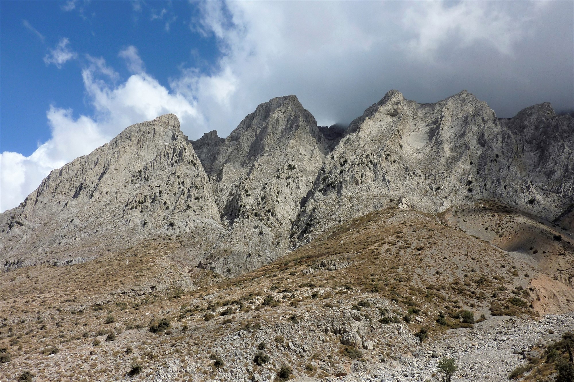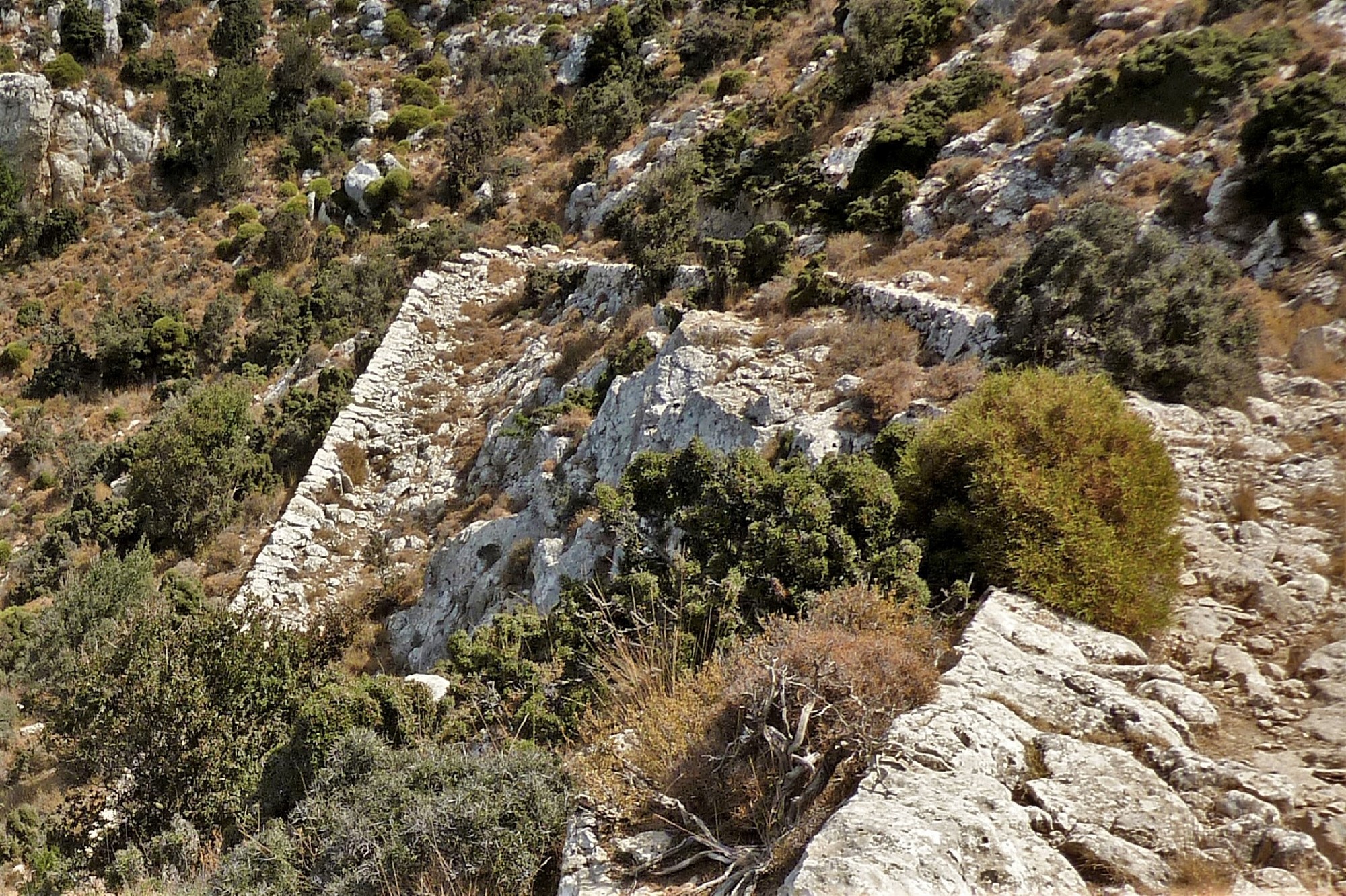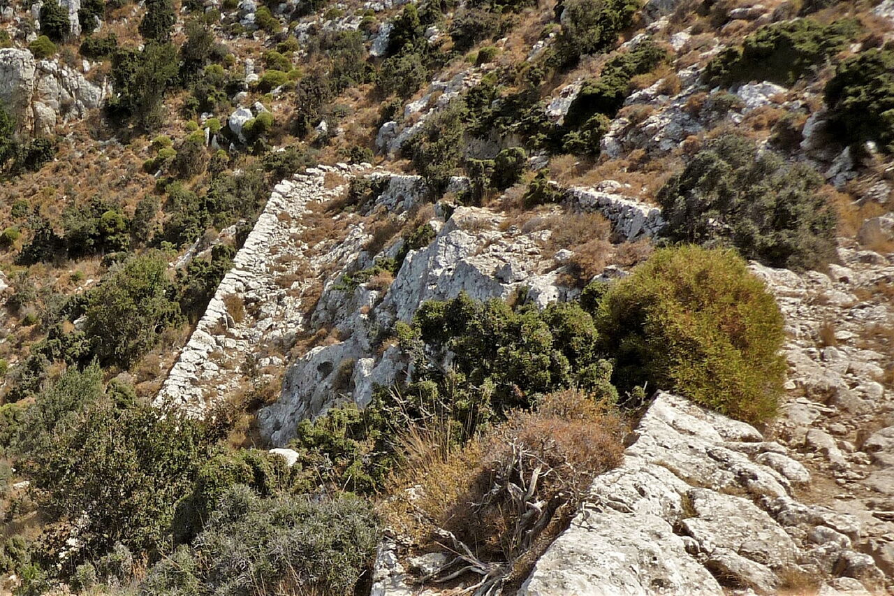 Wir erreichen eine Kreuzung, an der 3 Wege zusammenlaufen. Hier gehen wir halb rechts und nach 500 m verlassen wir unseren Weg wieder nach halb links auf einen beginnenden Pfad. Wir wandern an Prachtexemplaren von Kermeseichen entlang, parallel zu einem Trockenbachbett in einer kleinen Schlucht. 220 m nachdem wir das Bachbett nach links gequert haben, verlassen wir diese Schlucht nach links. Das nachfolgende Wegstück bis zur steinernen Hirtenhütte ist sehr gut gekennzeichnet. Wir gehen rechts an dieser vorbei und erreichen nach 250 m eine Trinkwasserquelle - Zeit, die Wasserreservoirs aufzufüllen. Auf der linken Seite des Weges befindet sich eine Ruine, rechts ein E4-Markierungsschild; wir steigen mittig zu der vor uns liegenden Ebene ab. Es folgt ein sehr gerölliger Abschnitt auf einem schwer auszumachenden Pfad. Wir queren 2 Schotterfelder und beginnen parallel zu dem zweiten Schotterfeld bis zur Einsattelung aufzusteigen – der 02 höchste Punkt (1806 m) der Wanderung.