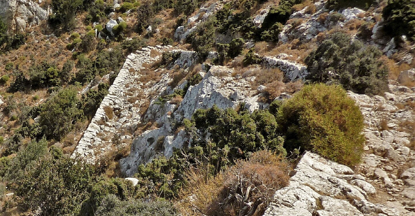 Ab hier beginnt ein wunderschöner alter Steinpfad, der bis zu einer Betonstraße hinunterführt. Direkt hinter den Hundehäusern – die Schafe sollen hier nicht vorbeigehen – gehen wir 80 m rechts, um dann vor dem Betongebäude mit der roten Tür sofort links hinunterzugehen. Wir queren die Asphaltstraße und gehen vor einem gelb-weißen Gebäude direkt auf das Dorf Agios Georgios zu. Wir erreichen die Dorfeingangsstraße und folgen dieser bis zum Dorfplatz, wo wir rechts gehen, um nach 80 m in die Straße links abzubiegen. Diese gehen wir bis zum Ende, um nach 50 m rechts das 05 Hotel in Agios Georgios (831 m) zu erreichen.
