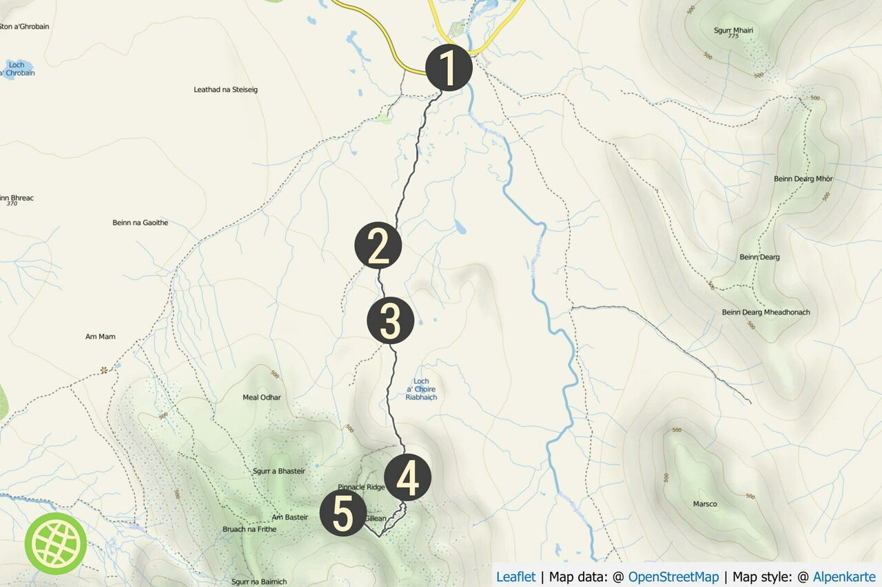 Pkw-Anfahrt: Der Start befindet sich 15 km südlich von Portree. Von der A87 biegt man beim Hotel Sligachan auf die A863 und kann nach 100 m auf der rechten Straßenseite vor dem Büro der Bergretter parken. Geokoordinaten: 57.289400 -6.175983. Busanbindung: Die Buslinien 52, 608, 916 und 917 fahren bis an die Kreuzung vor dem Hotel Sligachan.