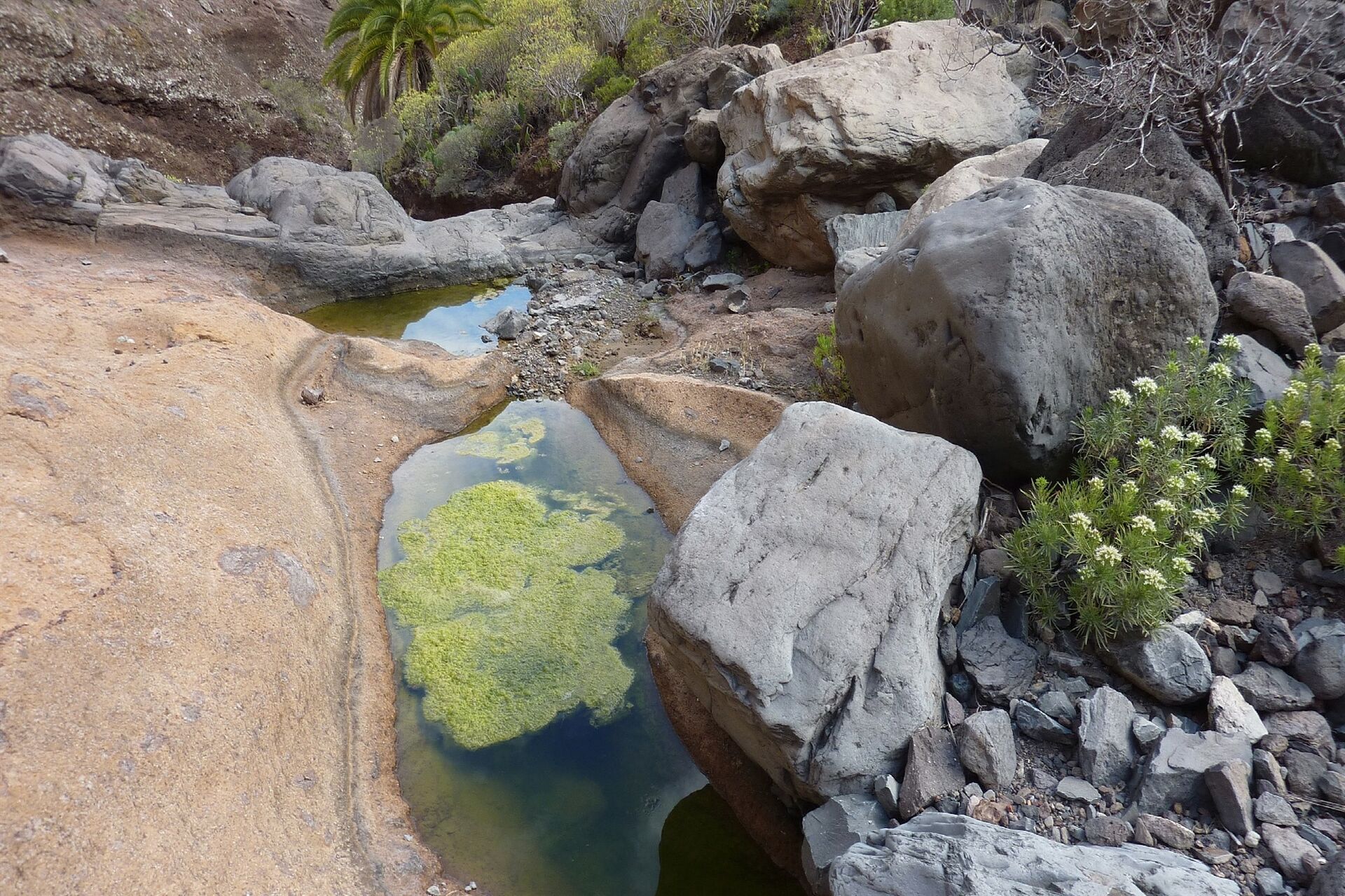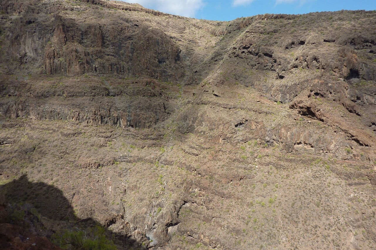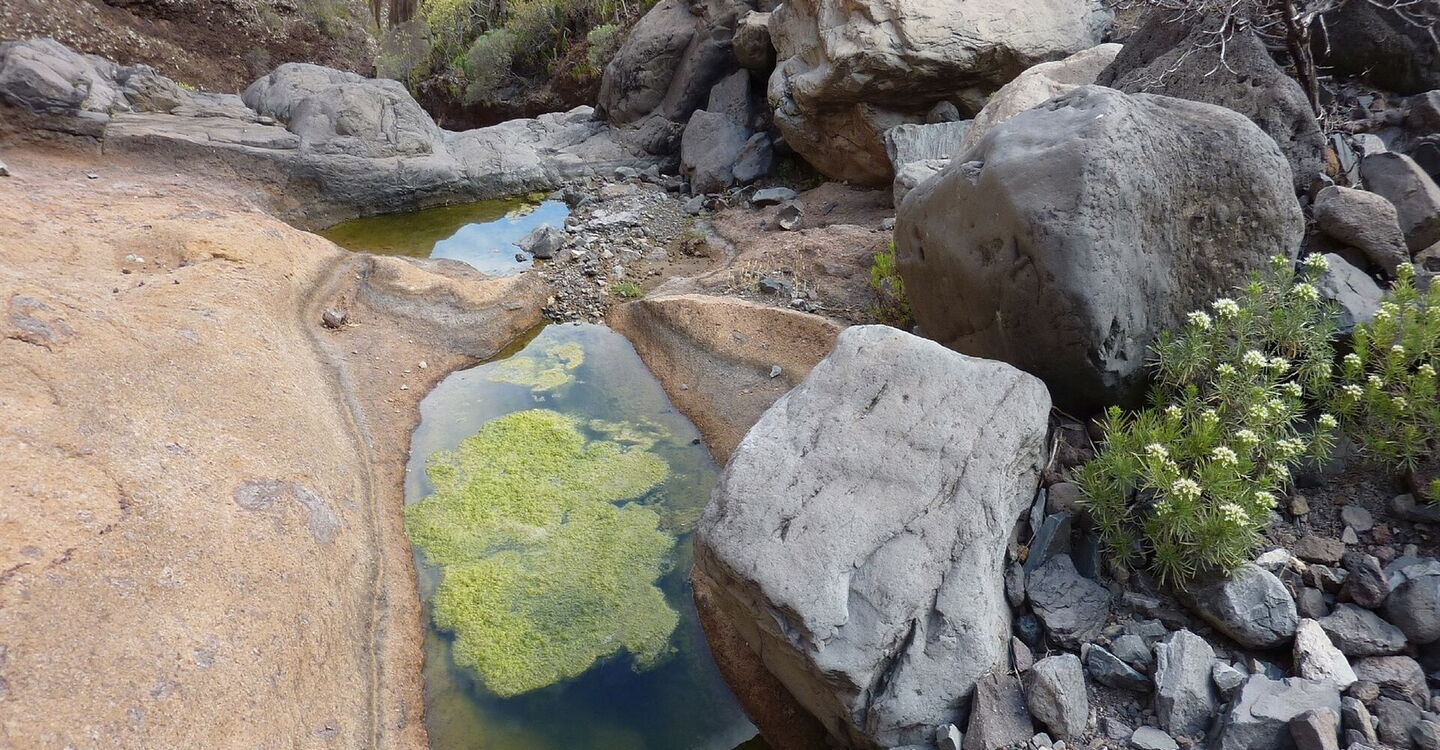 Wir sehen bereits in der Ferne eine Wasserleitung, die das Barranco quert und im weiteren Verlauf links, sowie rechts, die Hänge der Schlucht steil bergauf führt. An einer Gumpe, wo es kein Weiterkommen gibt, kann man nun wie nachfolgend beschrieben links aufsteigen oder man geht auf der Alternativroute - siehe Wegpunkt 05 -, halb rechts bergauf. An dieser Stelle, die auch mit einem Steinmännchen markiert ist, (04) verlassen wir das Barranco (280 m) nach links, gelangen auf die Überreste eines Pfads, der dann aber vor einer Felsstufe endet. Unterhalb dieses Felsbandes gehen wir 30 m bis zu einem kleinen Schluchtauslauf vor, in dem wir 25 m bergauf steigen, um dann nach rechts zur Wasserleitung zu queren. Nach einem kurzen Stück parallel zu dieser gehen wir geradeaus weiter, während die Wasserleitung nun rechts die extrem steil den Hang hinaufführt. Wir steigen zwischen dem links von uns liegenden Barranco und der Felswand rechts von uns bergauf. Im oberen Bereich orientieren wir uns Richtung dieser Felswand, gehen unterhalb dieser entlang, bis wir wieder auf einen Pfad treffen, der in den Hinweg mündet.