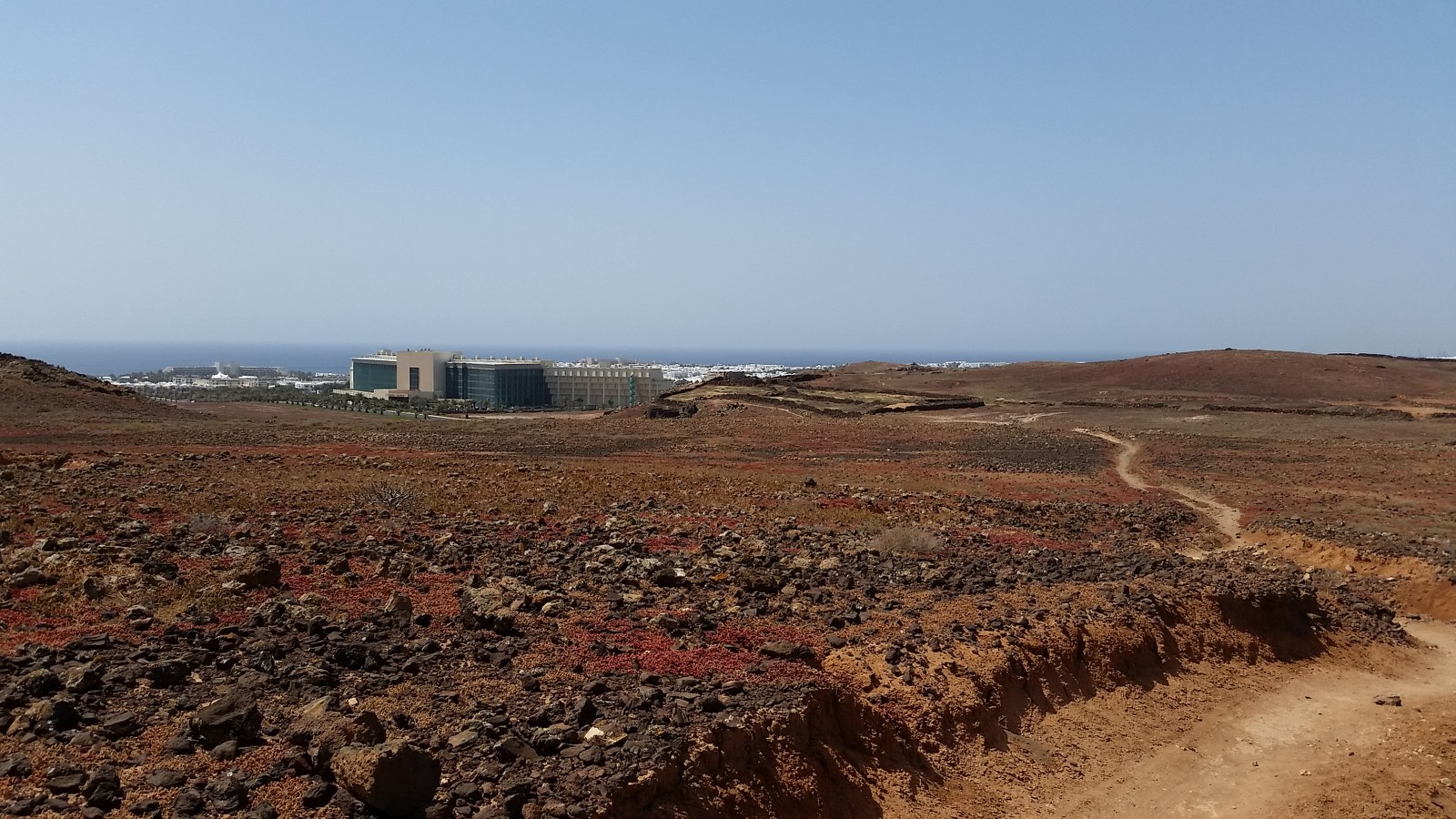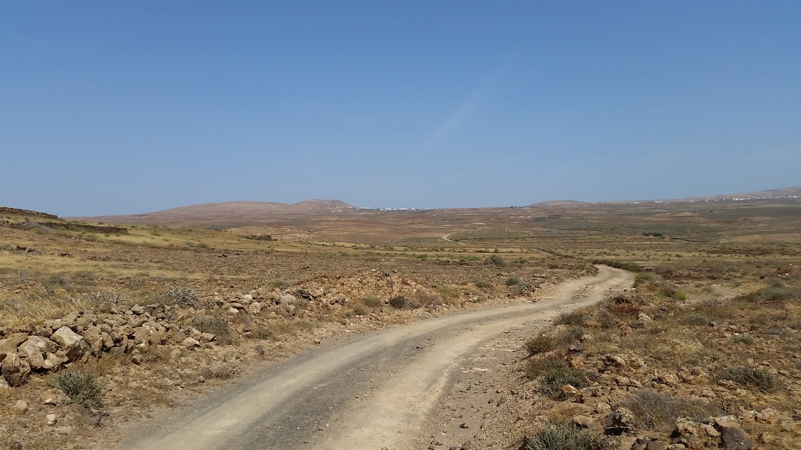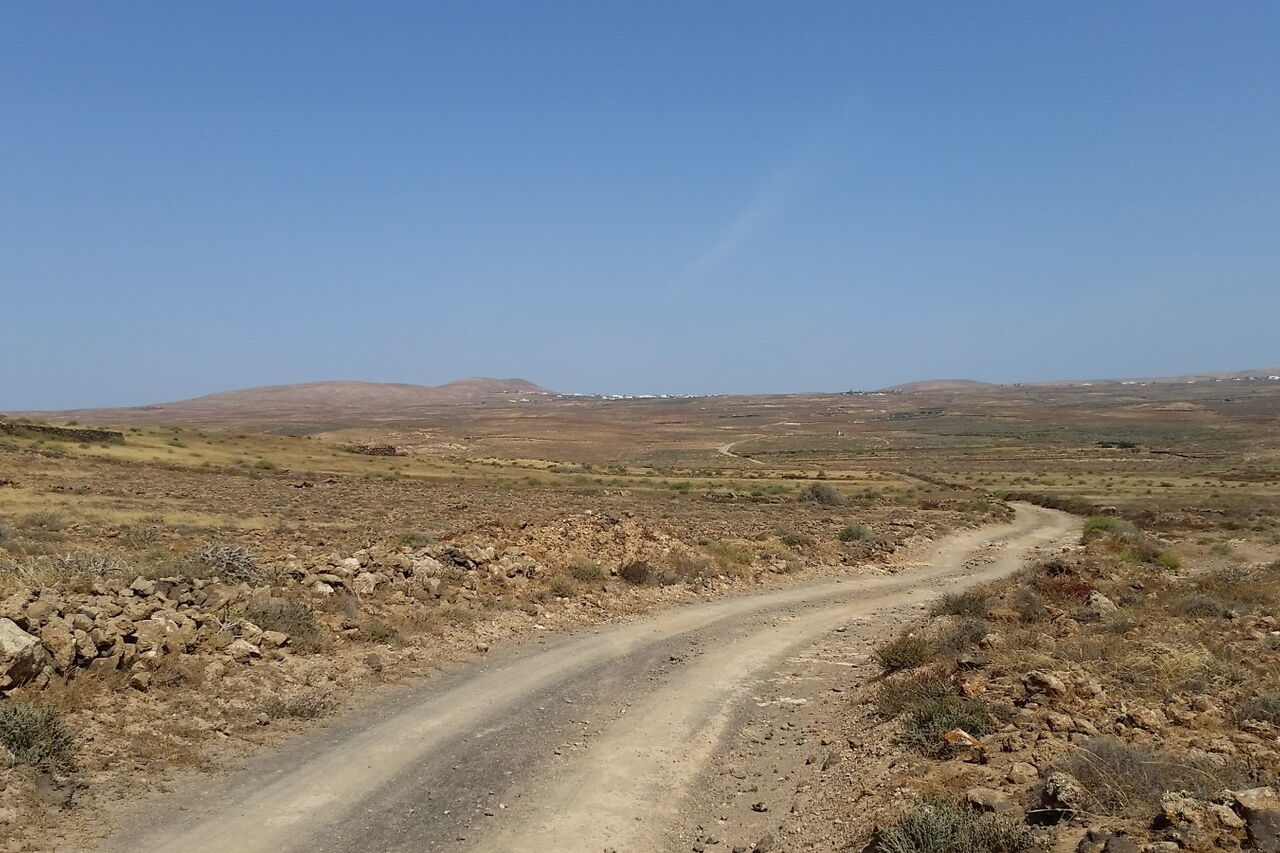 Wir müssen die Hauptstraße umgehen, indem wir 400 m links gehen - parallel zur LZ-1. Wir unterqueren die LZ-1 und gehen anschließend sofort wieder rechts - abermals parallel zur LZ-1 -, um nach 400 m links auf dem Schotterweg weiterzuwandern. Nach einigen Metern folgt das Schild "important birds area" und nach 1 km queren wir eine Kreuzung. Im Abstand von 300 m geht es vorbei an einem Haus auf der rechten sowie einem weiteren Haus auf der linken Seite der Schotterpiste. Kurz hinter einer Anhöhe, es geht leicht bergab, gehen wir bei der Weggabelung rechts. Unmittelbar danach queren wir ein Barranco. Nach einem Wegstück mit hellem Sandboden, rechts von uns schaut man in die Öffnung des (04) Vulkans Monte Corona (71 m), nehmen wir bei der folgenden Weggabelung den rechten Pfad Richtung Hotel Beatriz.