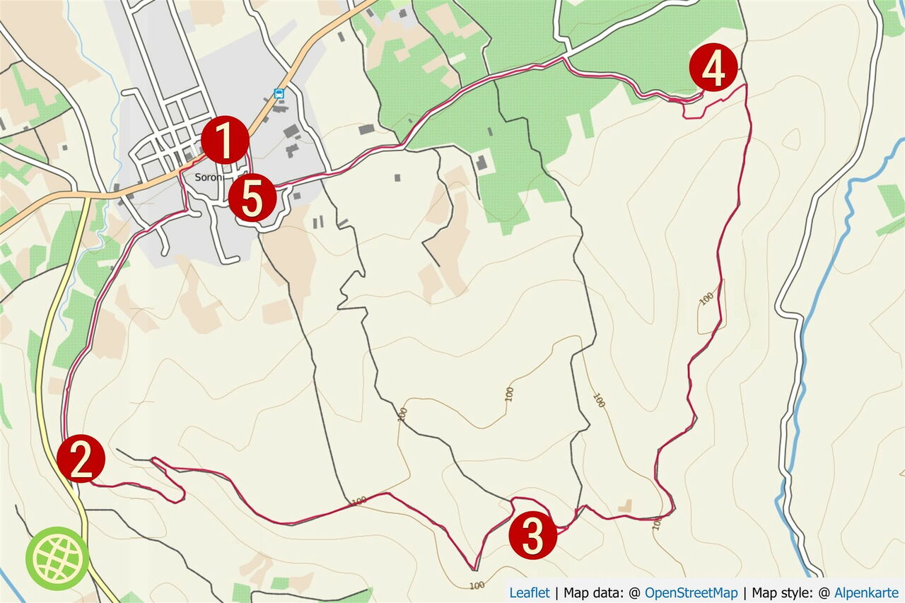 Nach dem Besuch des Klosters gehen wir auf der Asphaltstraße, bis diese endet. Hier gehen wir links, nun direkt auf die (05) Kirche von Soroni (23 m) zu. Sobald wir auf direkter Höhe der Kirche sind, biegen wir in die Straße rechts, auf der wir den Ausgangspunkt erreichen.