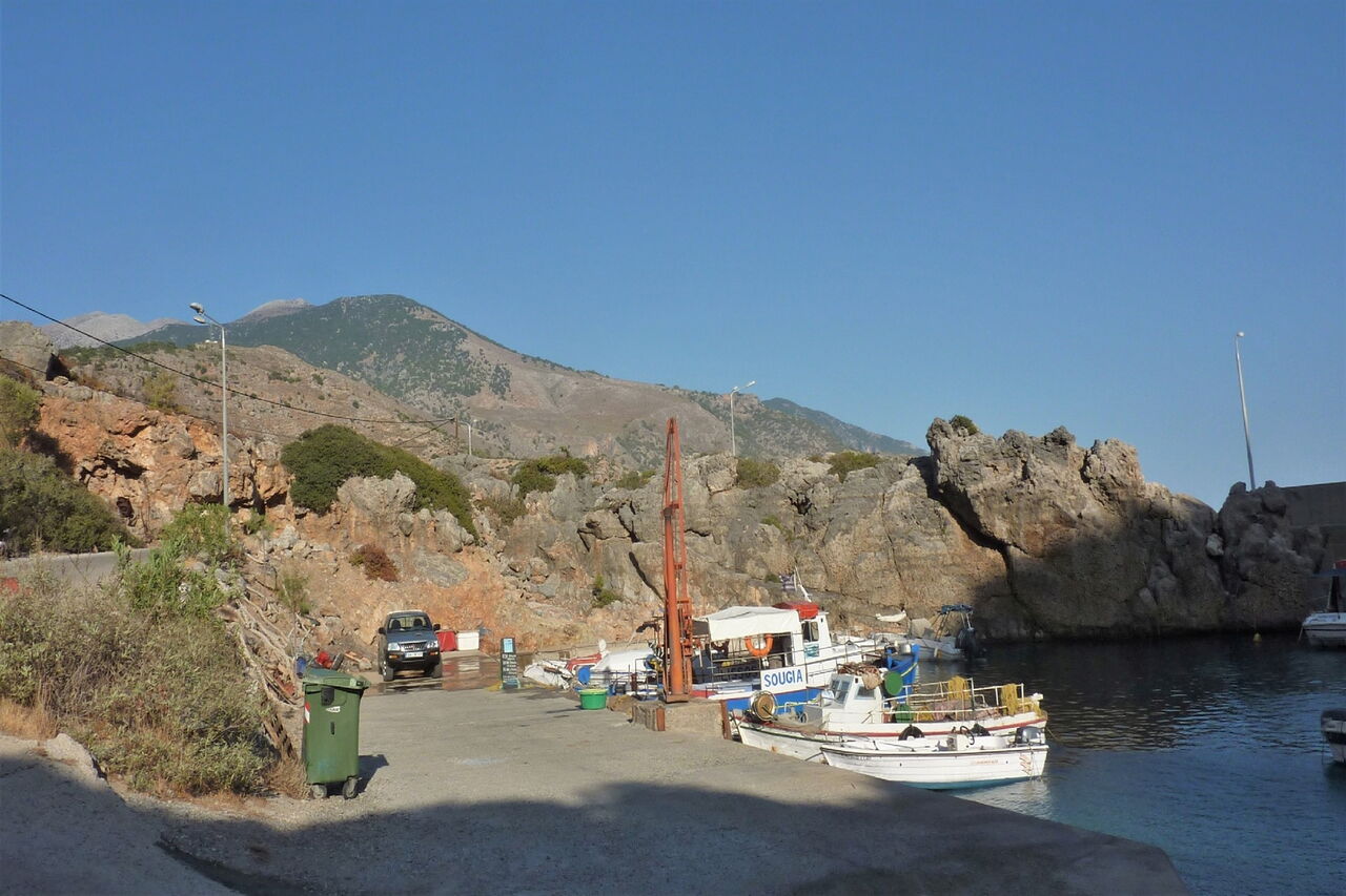 Von 01 Sougia (3,5 m) wandern wir auf der Promenade in westliche Richtung bis zum kleinen Hafen. Ein kleines Stückchen hinter der Hafenmole gehen wir über einen kurzen Strandabschnitt in die Schlucht.