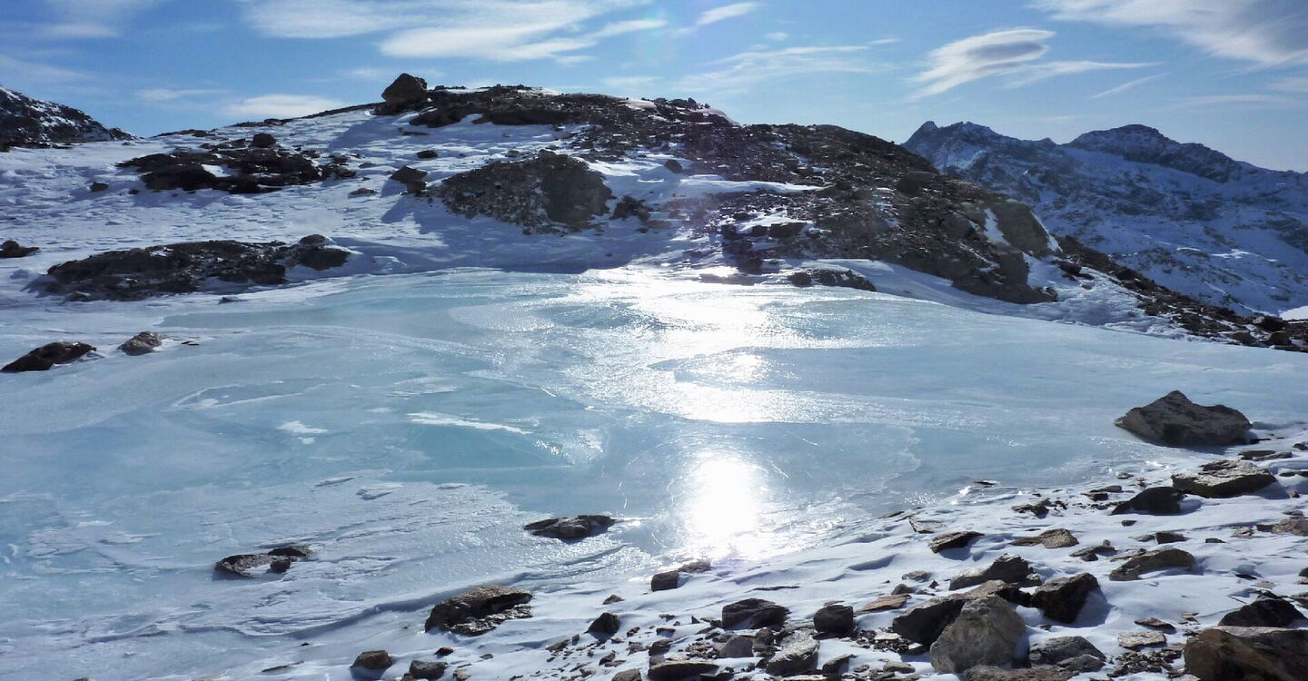 Bei der Bergstation der Seilbahn Nr. 26 Passo dei Salati Indren fahren wir gleich rechts, aber nicht unter der Seilbahn hindurch. Nach 600 m umfahren wir rechts einen gefrorenen Gletschersee.