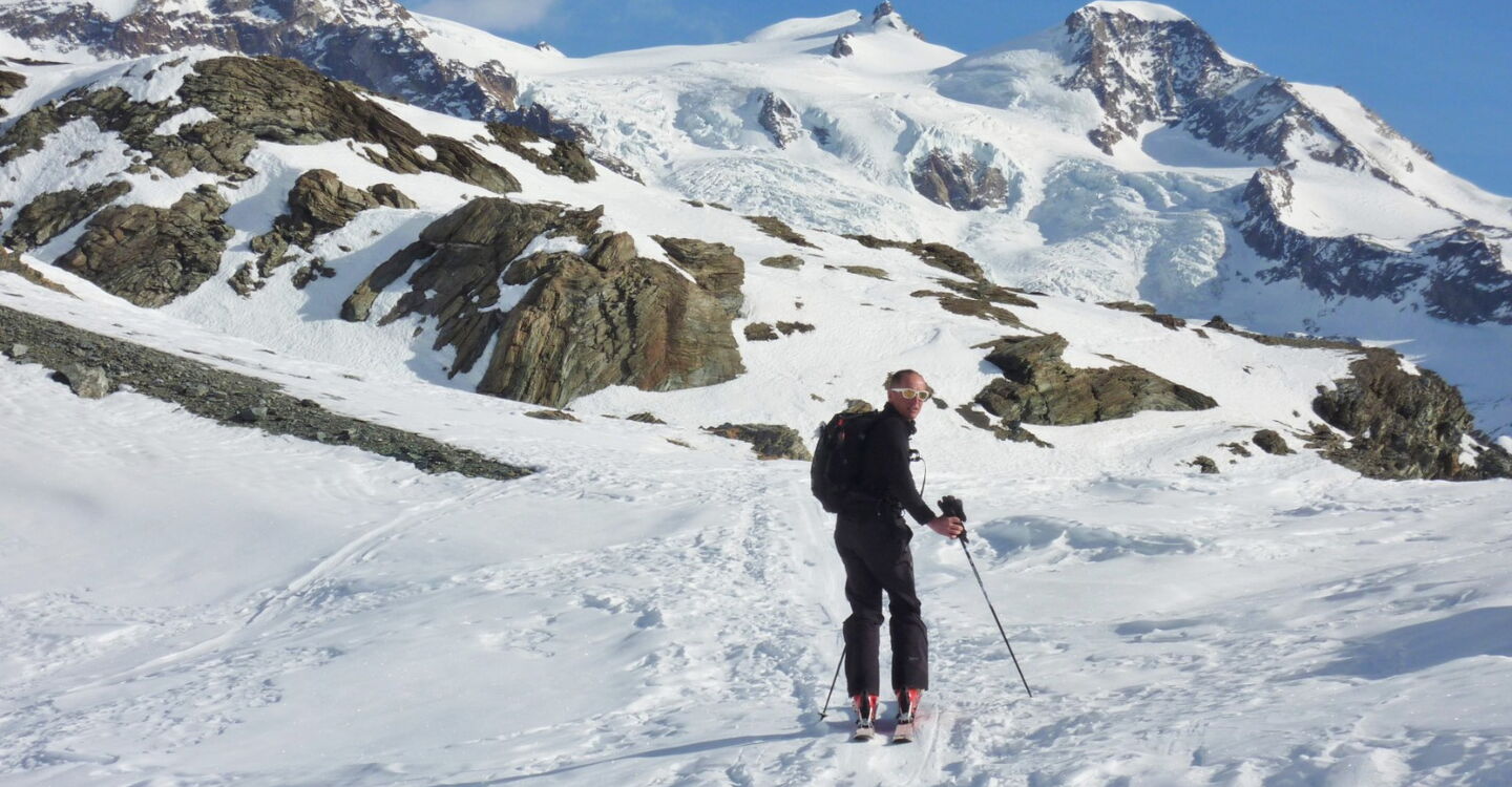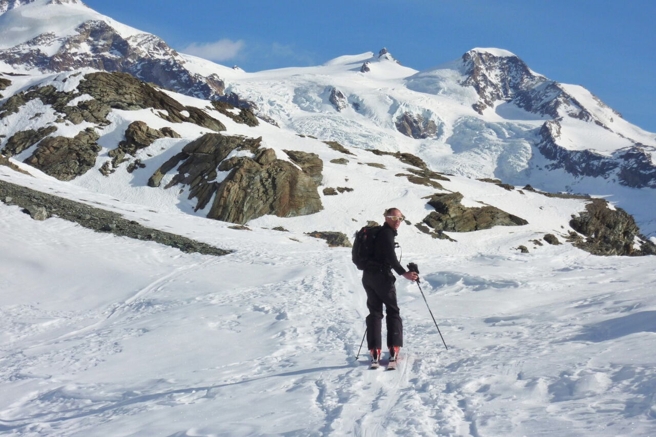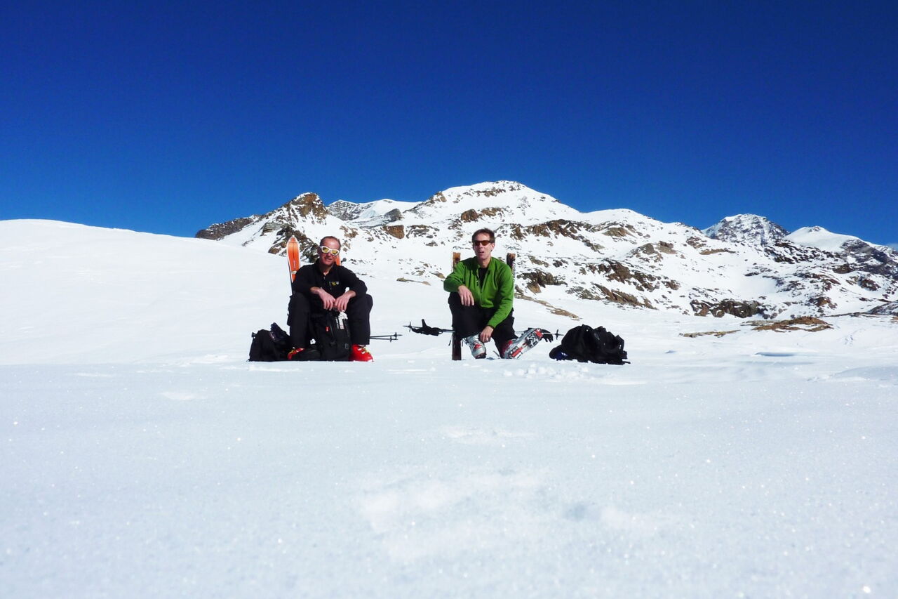 Nach einer Pause am Pass mit grandiosem Ausblick auf die umliegende Bergwelt folgt eine rasante Abfahrt auf weiten und unberührten Hängen, bis wir eine Endmoräne rechts liegen lassen.