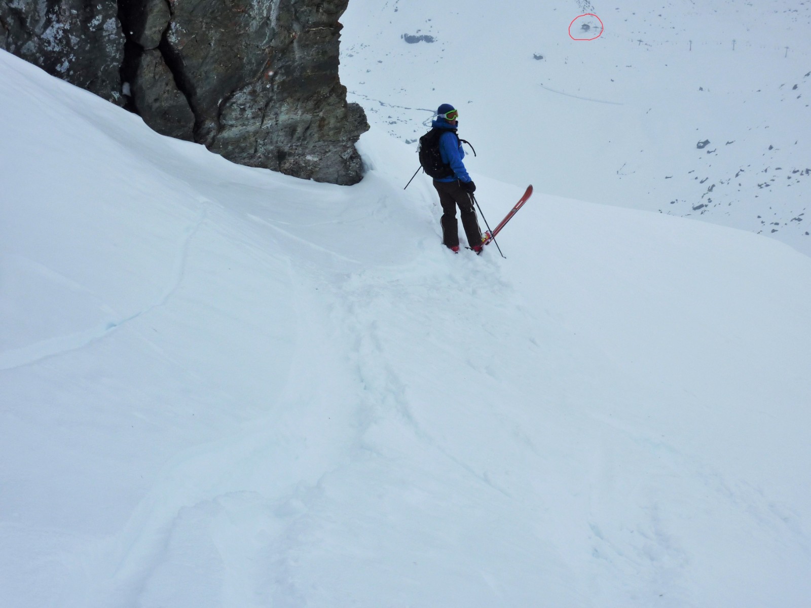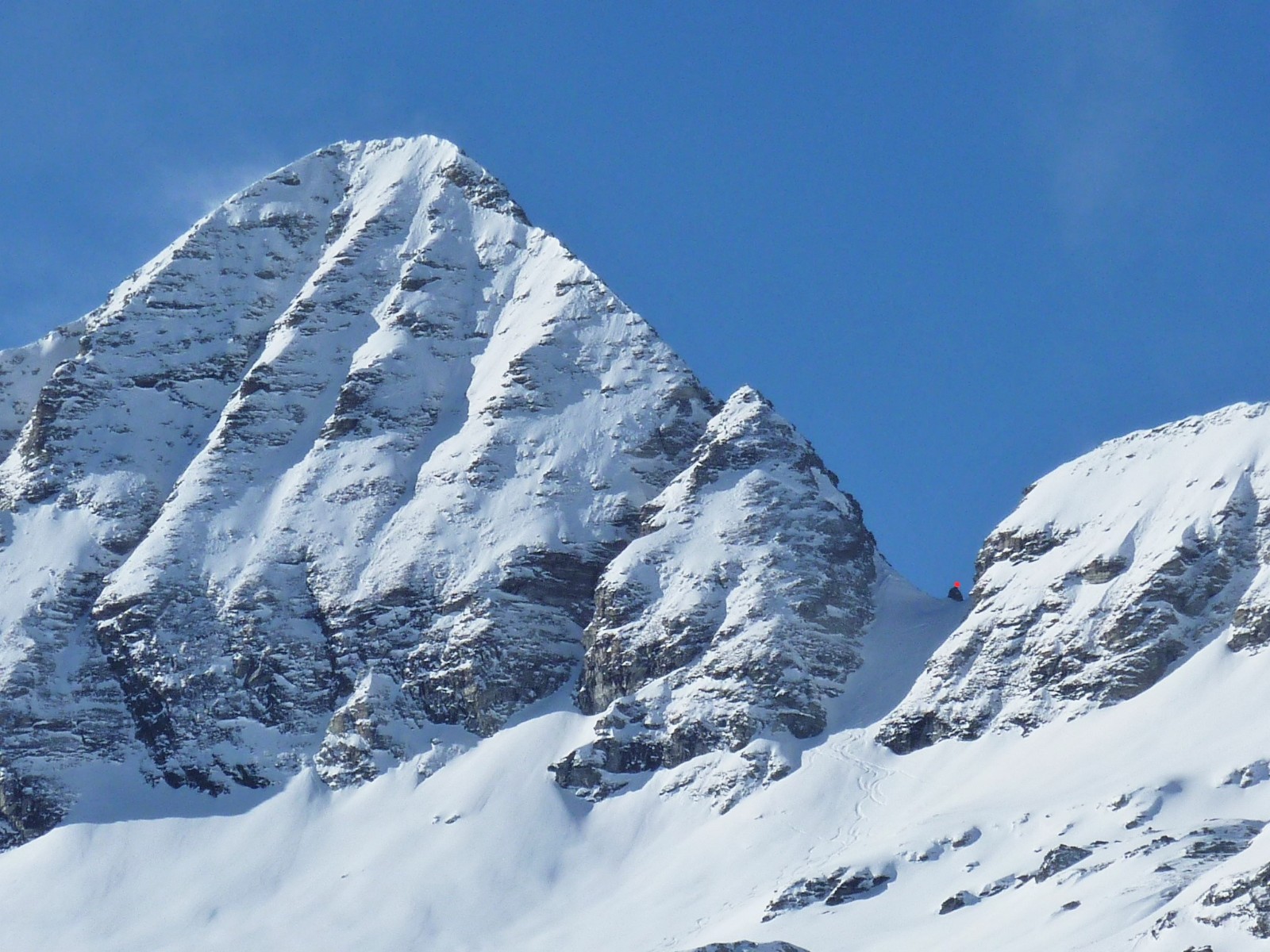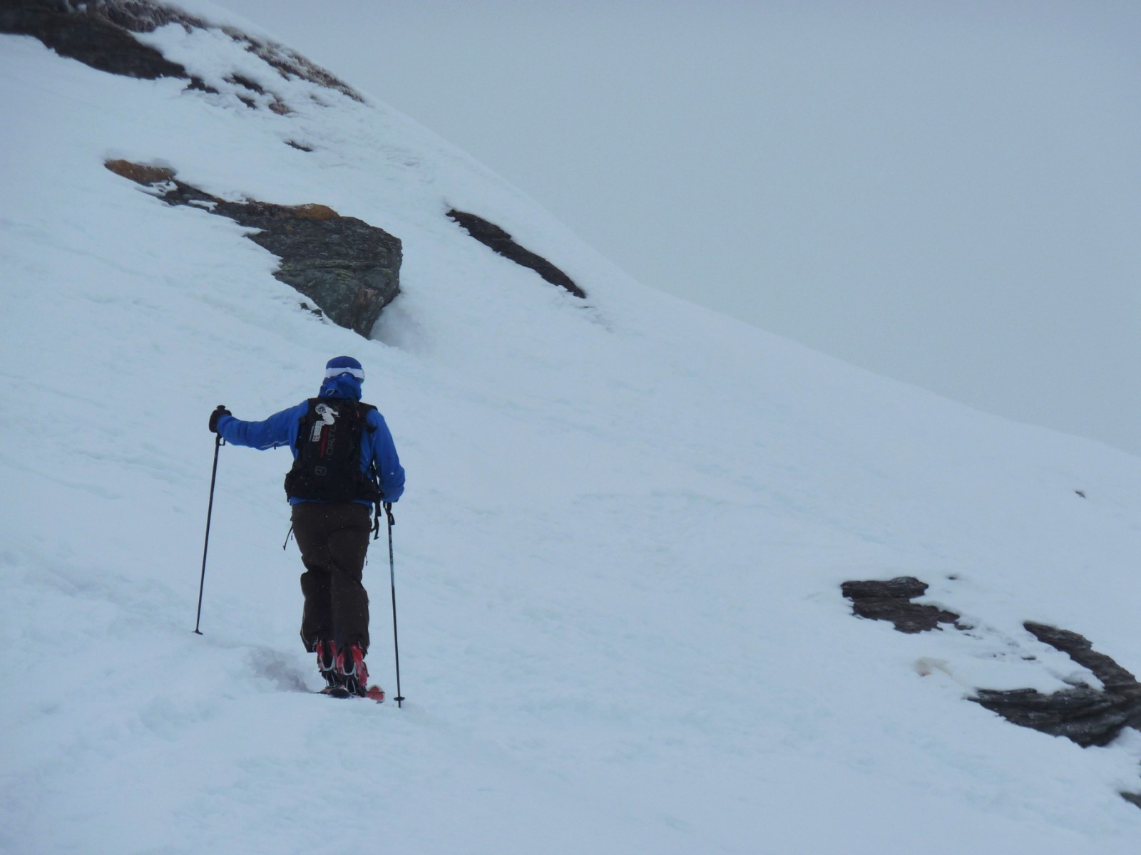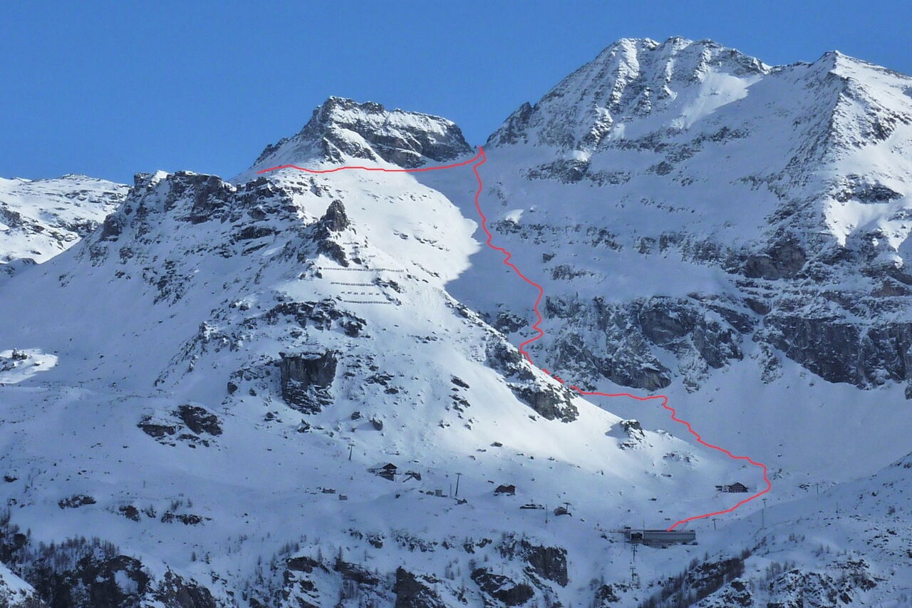 Einfache Abfahrt über den Gletscher. Bitte unbedingt die Absturzwarnung hinter dem Canyon beachten. Die Abfahrt führt über einen Westhang. Folgende Ausrüstung wird empfohlen: Produkte für alpine Sicherheit im Schnee, Tourenski und Skitourenhelm. Es gibt keine Einkehr auf der Tour. Außer man nimmt vor oder nach der Tour eine Stärkung in dem Rifugio Città di Vigevano. Beste Jahreszeit: Januar bis April. Uns erwarten kurze Stücke mit bis zu 30° Hangneigung.