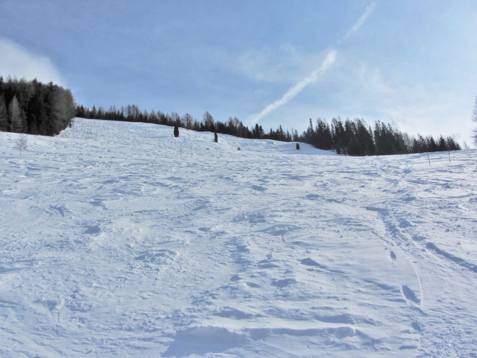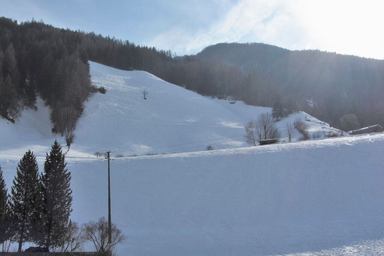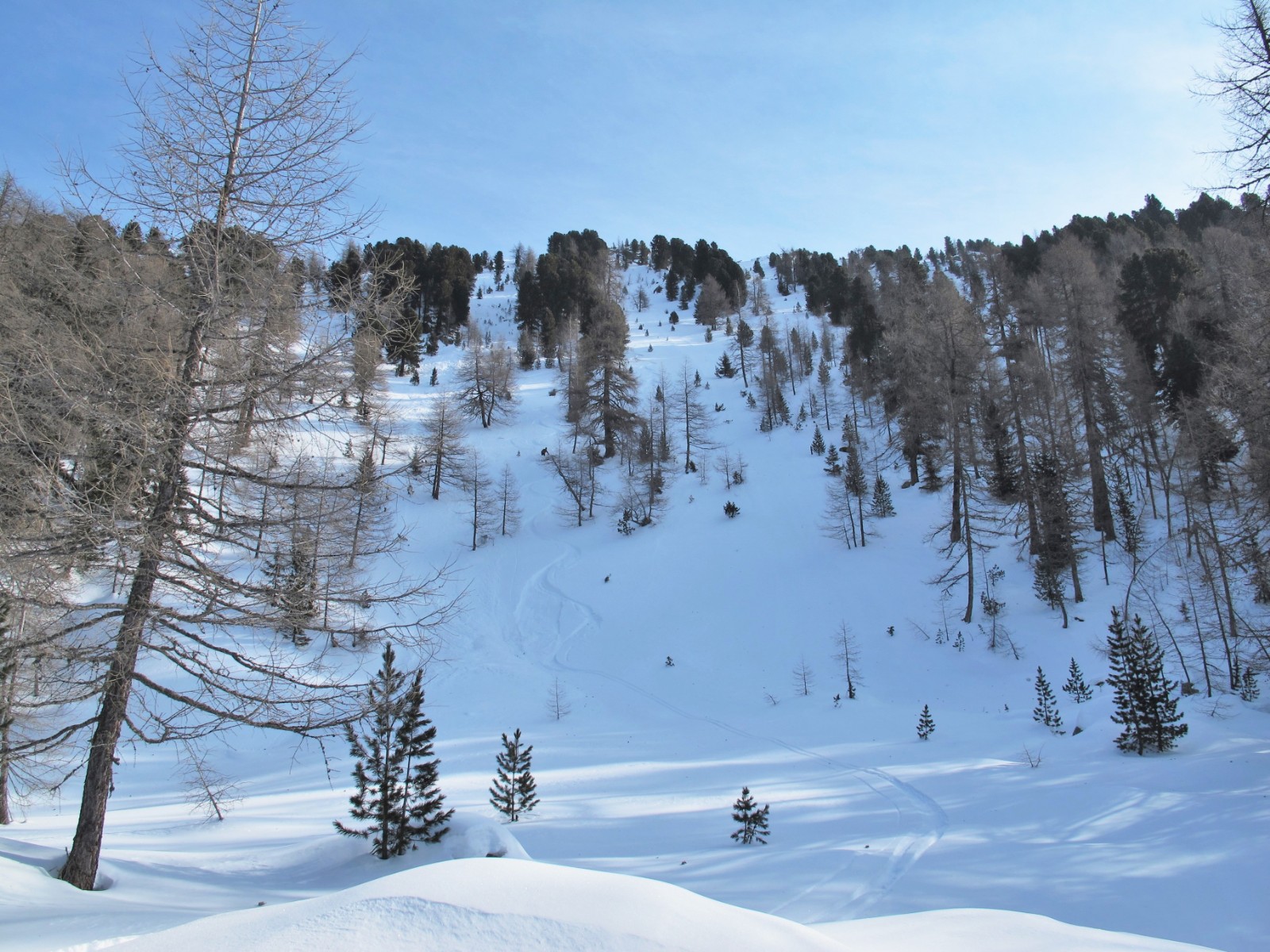 An der Bergstation des Sessellifts Hühnerspiel fellen wir auf, gehen links vom Lift Richtung Süden und steigen auf dem Grat, auf dem uns immer wieder lichte Waldstellen begegnen, ca. 200 hm auf den Bachberg.