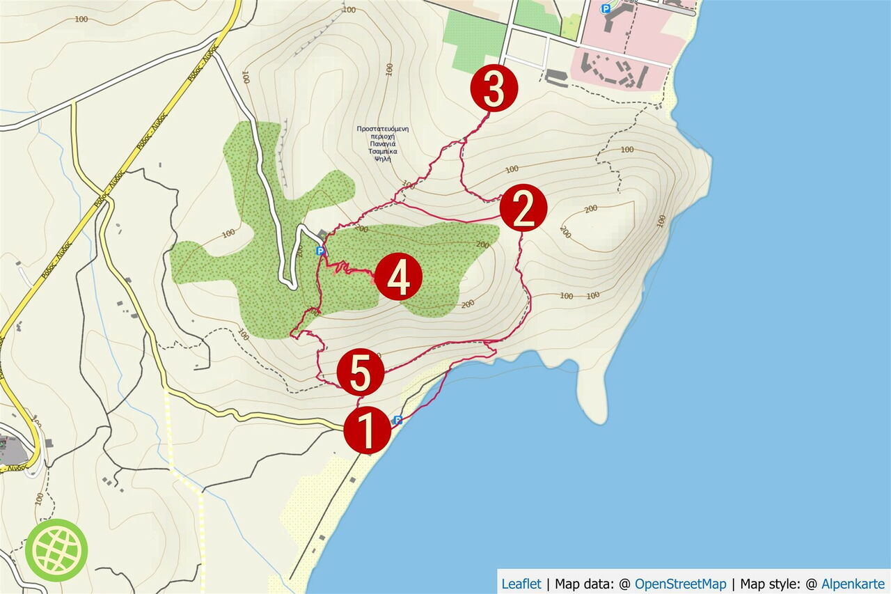 Wir gehen am (01) Strand von Tsambika (2 m) in Richtung des großen Steins, der mit der griechischen Flagge bemalt ist. Der folgende Aufstieg stellt die schwierigste Passage der Wanderung dar. Zunächst steigen wir über die dahinter liegenden Dünen zu einem Oleanderbusch auf, der auf einem Hügel steht. Direkt dahinter steigen wir unter Zuhilfenahme der Hände in einer Erosionsrinne auf, bis wir auf einen im Hang quer verlaufenden Pfad treffen. Viele Pfade erschweren die Orientierung. Wir halten uns in Richtung des Kaps, bis wir links oberhalb eine Höhle ausmachen können. Bei einem Steinmännchen unterhalb der Felsen machen wir eine 180°-Kehrtwendung, klettern abermals unter Zuhilfenahme der Hände durch eine kleine Rinne und treffen auf den Wanderpfad. Immer den Steinmännchen folgend, steigen wir nun zu einer Einsattelung auf.