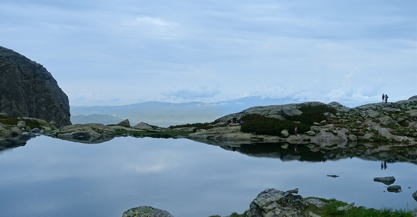 Nach einem rutschigen Aufstieg über die Felsen – an einigen Stellen ist der Pfad mit Ketten gesichert – erreichen wir dann den 160 × 80 m großen See 05 Pleso nad Skokom (1801 m). Schaut man Richtung Süden, so spiegelt sich im See die Bergwelt der Niederen Tatra. Schaut man von Südwesten über den See, so sieht man den 2421 m hohen Berg Satan und Richtung Hauptkamm der Hohen Tatra den 2381 m hohen Berg Štrbský štít. Wir gehen auf dem bekannten Hinweg zurück.