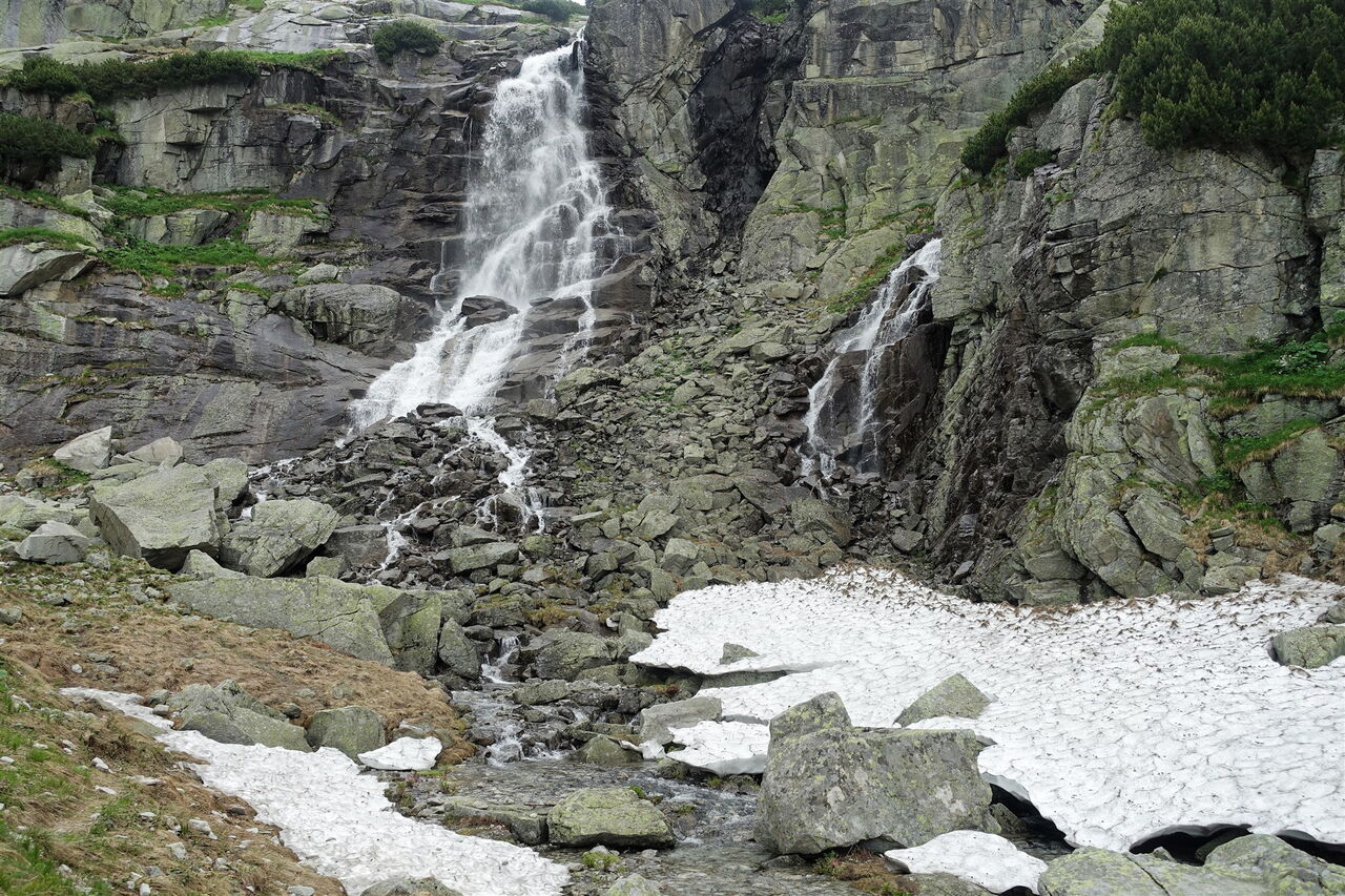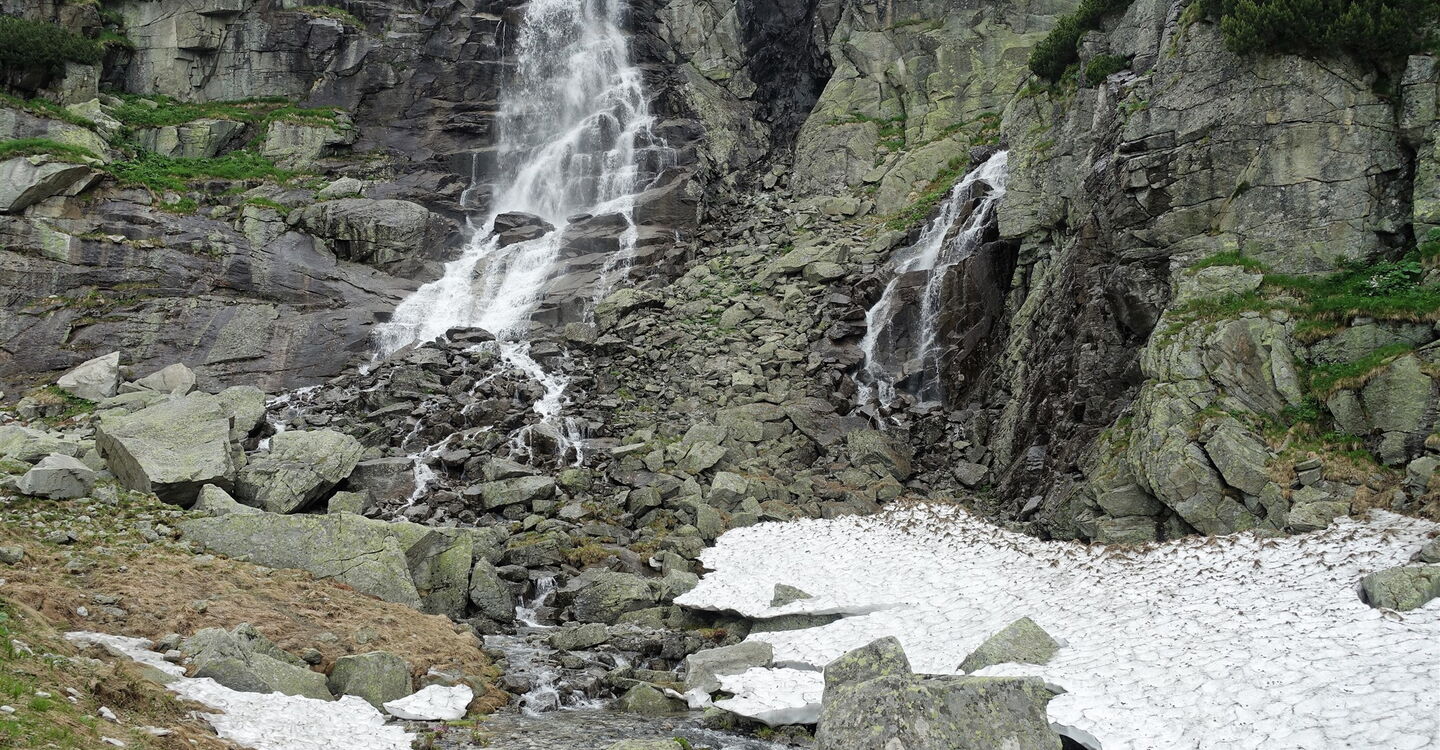 Sobald wir die Vegetationszone der Latschenkiefern hinter uns gelassen haben, sehen wir schon aus der Ferne den Wasserfall 04 Vodopád Skok (1681 m), an dem das Wasser des Baches Mlynické potok herunterstürzt.