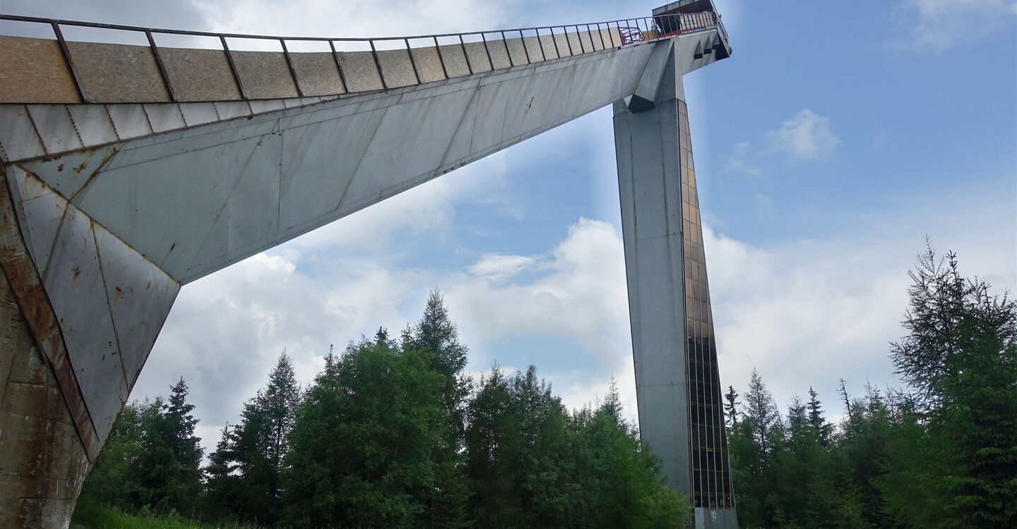 Auf Höhe der Liftanlagen und der dahinter liegenden kleinen und großen Sprungschanze beginnt dann die 02 Mlynická Dolina (1333 m). Parallel zu einem Sessellift folgen wir dem gelb markierten Wanderweg. Hinter einem sehr modern gestalteten Wasserpumpenhaus gabelt sich der Weg, wir gehen halb links in Richtung des Sessellifts.