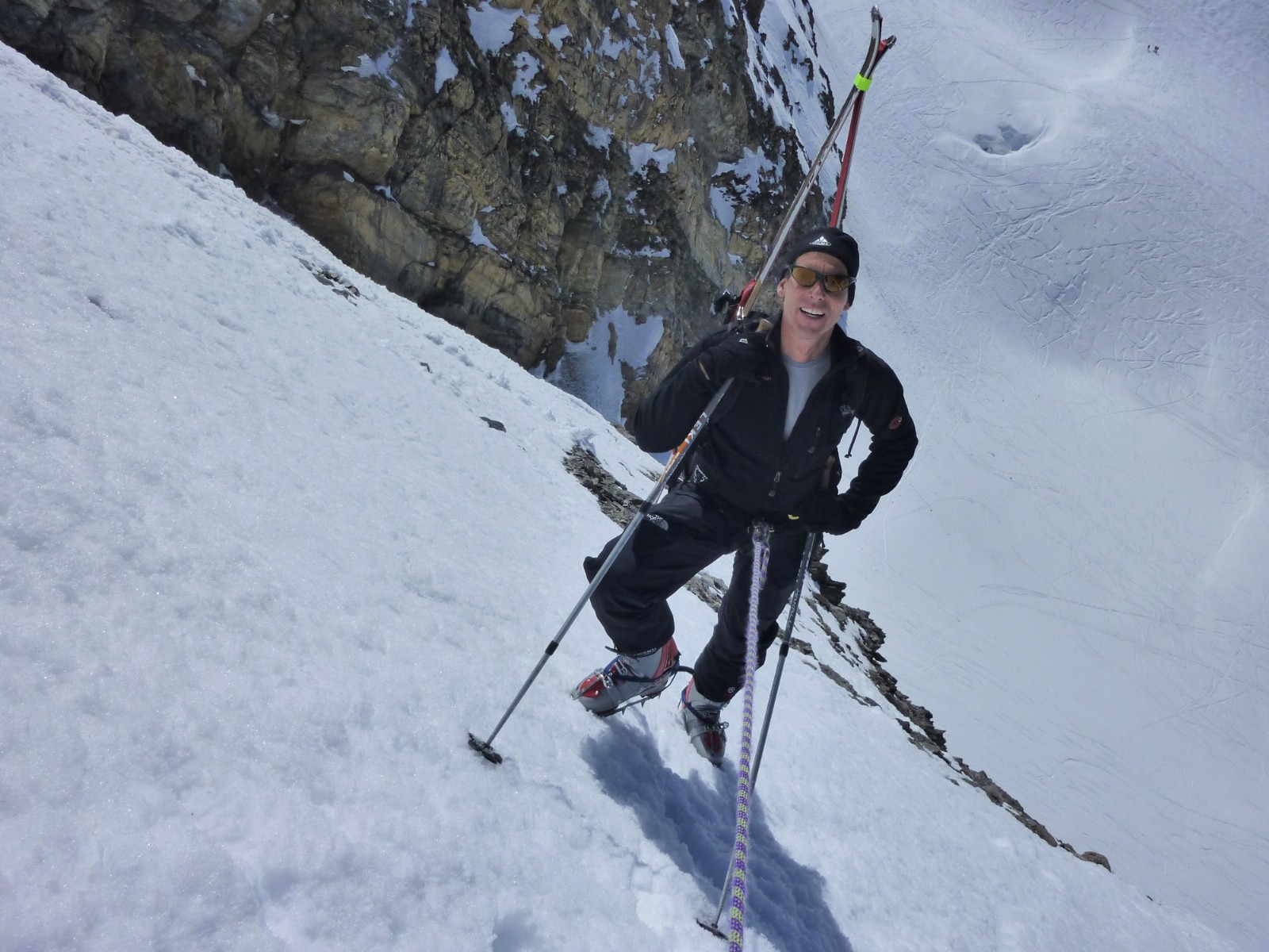 Nun folgt ein sehr steiler Aufstieg mit Steigeisen und Seil, für mich Flachlandtiroler schwierig und für viele andere vielleicht auch. Die ersten 250 hm zum Eisseepass sind geschafft.