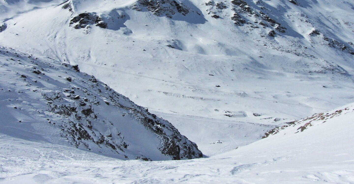 Wir queren die Piste von der Madritschhütte kommend, bevor wir direkt auf die Skiroute Nr. 5, das Kanonenrohr, einsteigen.