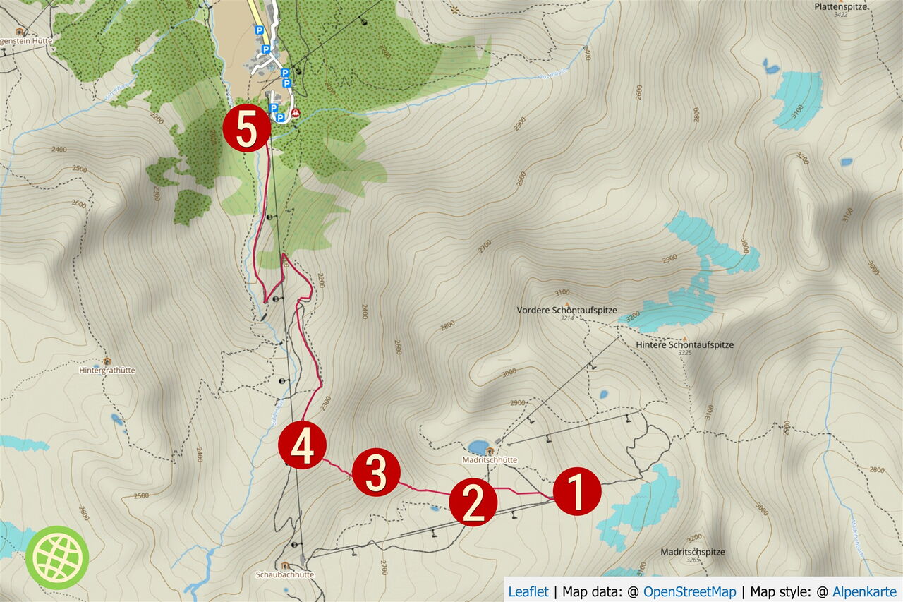 Der Startpunkt dieser Tour liegt bei der Bergstation des Lifts C Madritschsessellift. Wir steigen nach links aus, verlassen bereits nach 50 m die Piste und fahren Richtung Westen.