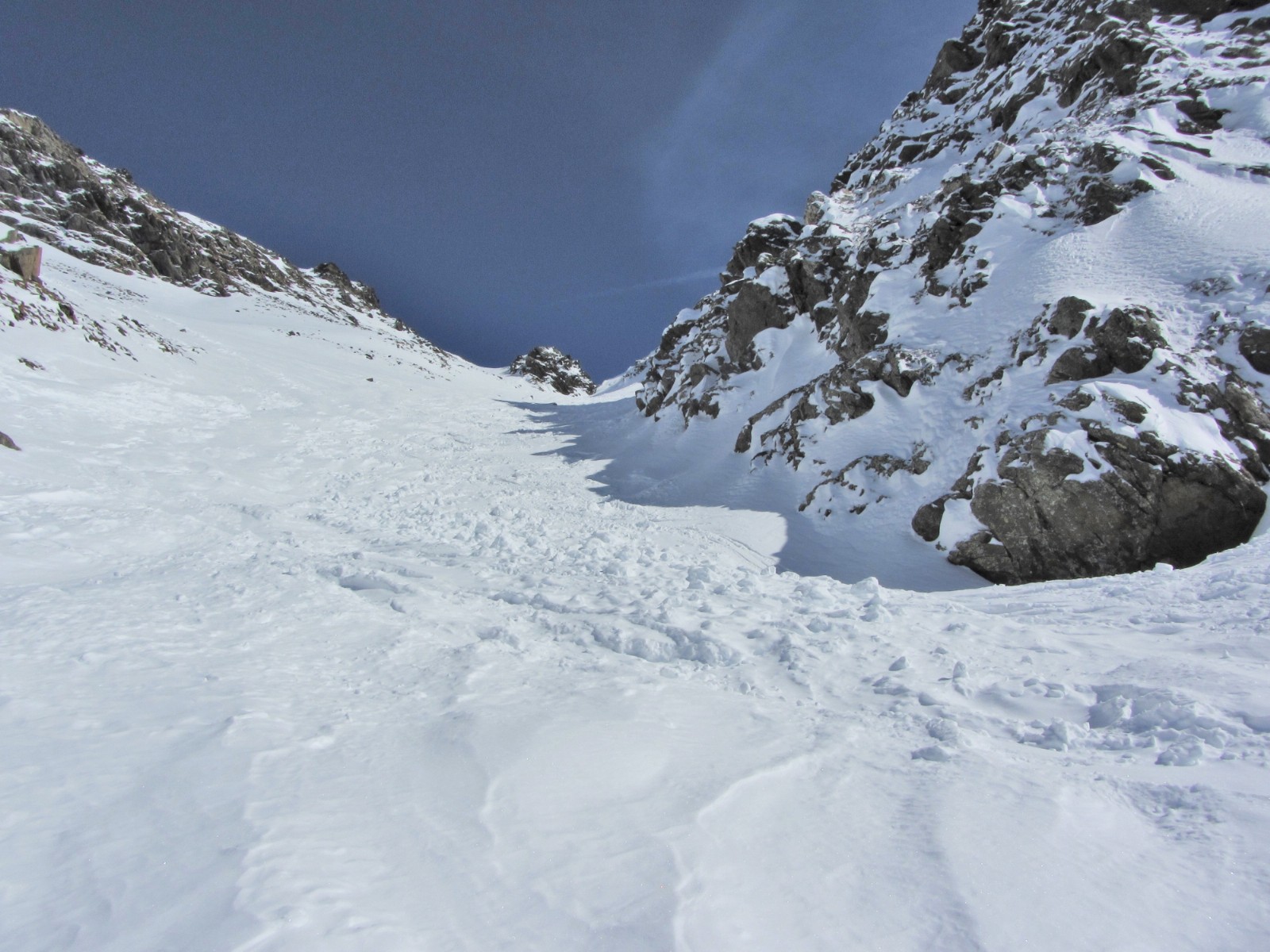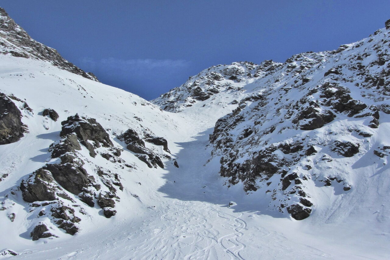 Einfache Orientierung auf dem Freeride-Stück außerhalb der markierten Pisten. Die Abfahrt führt über einen Westhang. Folgende Ausrüstung wird empfohlen: Produkte für alpine Sicherheit im Schnee, Freerideski und Skitourenhelm. Es gibt keine Einkehr auf der Tour. Beste Jahreszeit: Januar bis April. Uns erwarten kurze Stücke mit bis zu 40° Hangneigung.