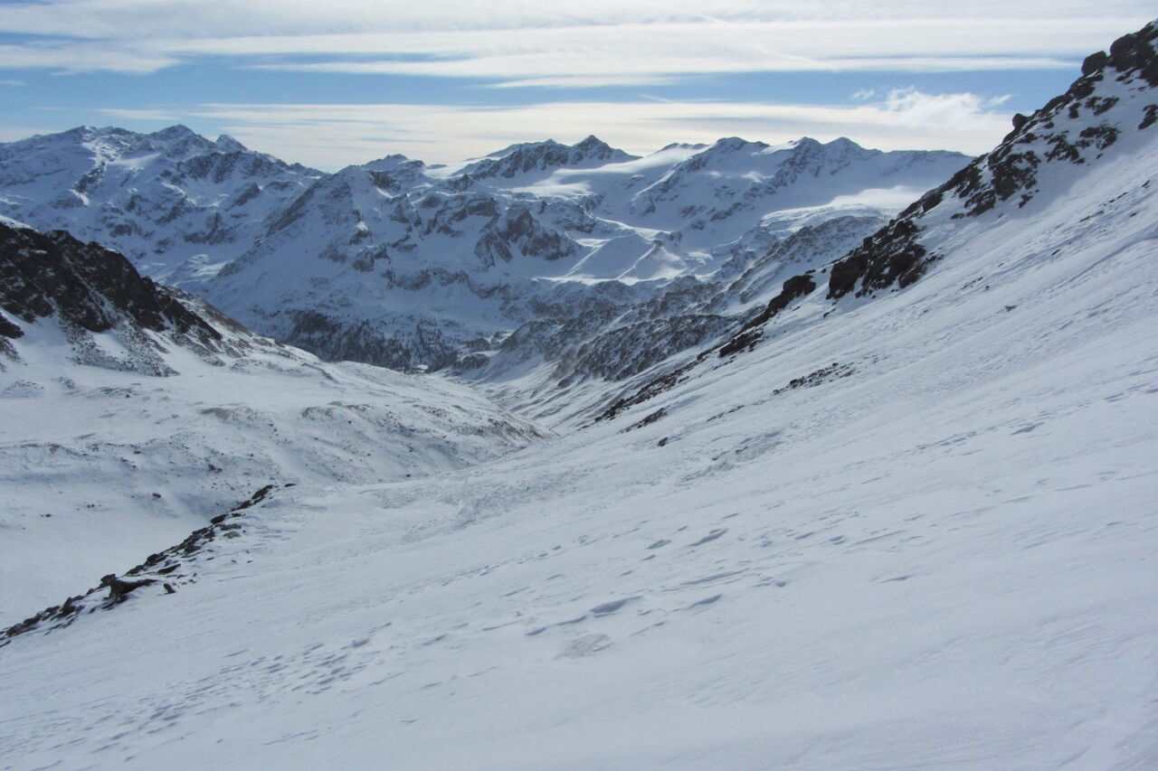 Vor uns liegen 450 hm Abfahrt. Bei Wegpunkt 3 ziehen wir die Felle auf und gehen westlich in Richtung Madritschspitze. Auf unserer Tour kam völlig unerwartet ein sehr starker Sturm auf.