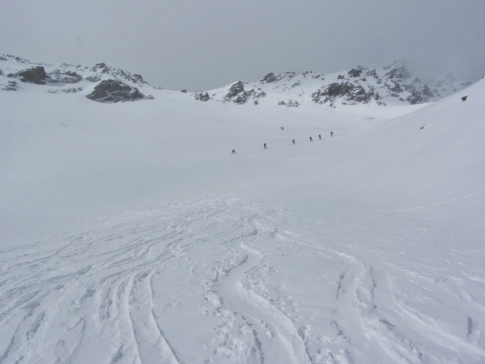 Plötzlich hatten wir einen Wolkendeckel ab 2.900 m und eine damit verbundene sehr schlechte Sicht. Die 60 cm Neuschnee vom Vortag wurden innerhalb kürzester Zeit irgendwohin verfrachtet.