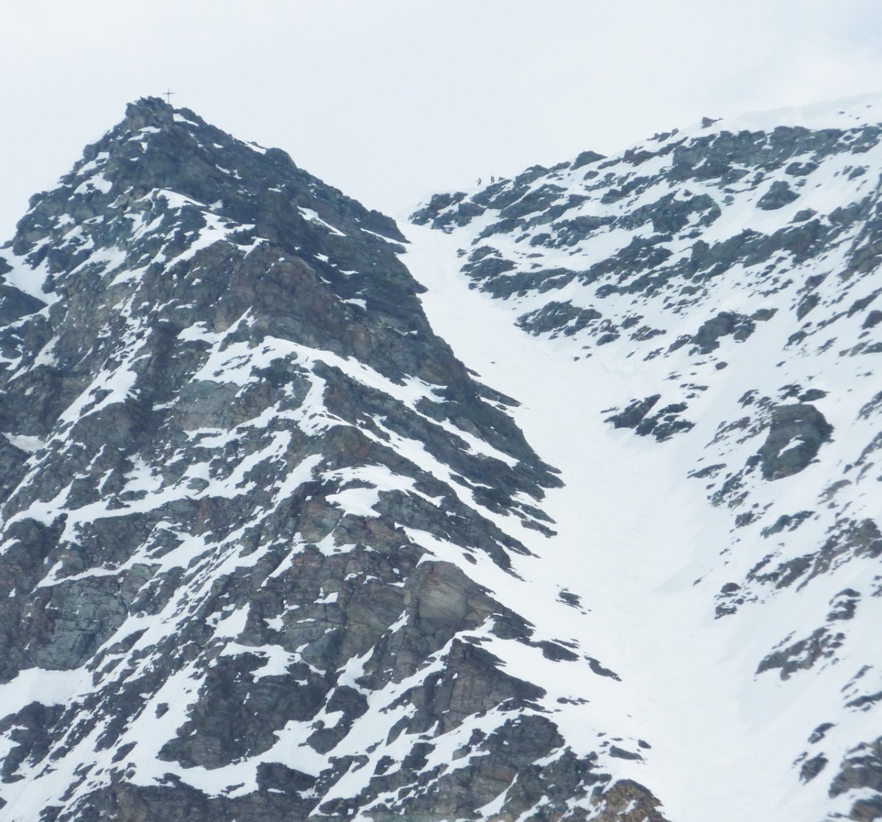 Mein Bergführer Hubert hatte das "Lawinen-Panik-Gesicht". Wir haben die Abfahrt durch die Scharte, wie im Bild gezeigt, nicht gemacht und sind den gleichen Weg zurückgegangen.