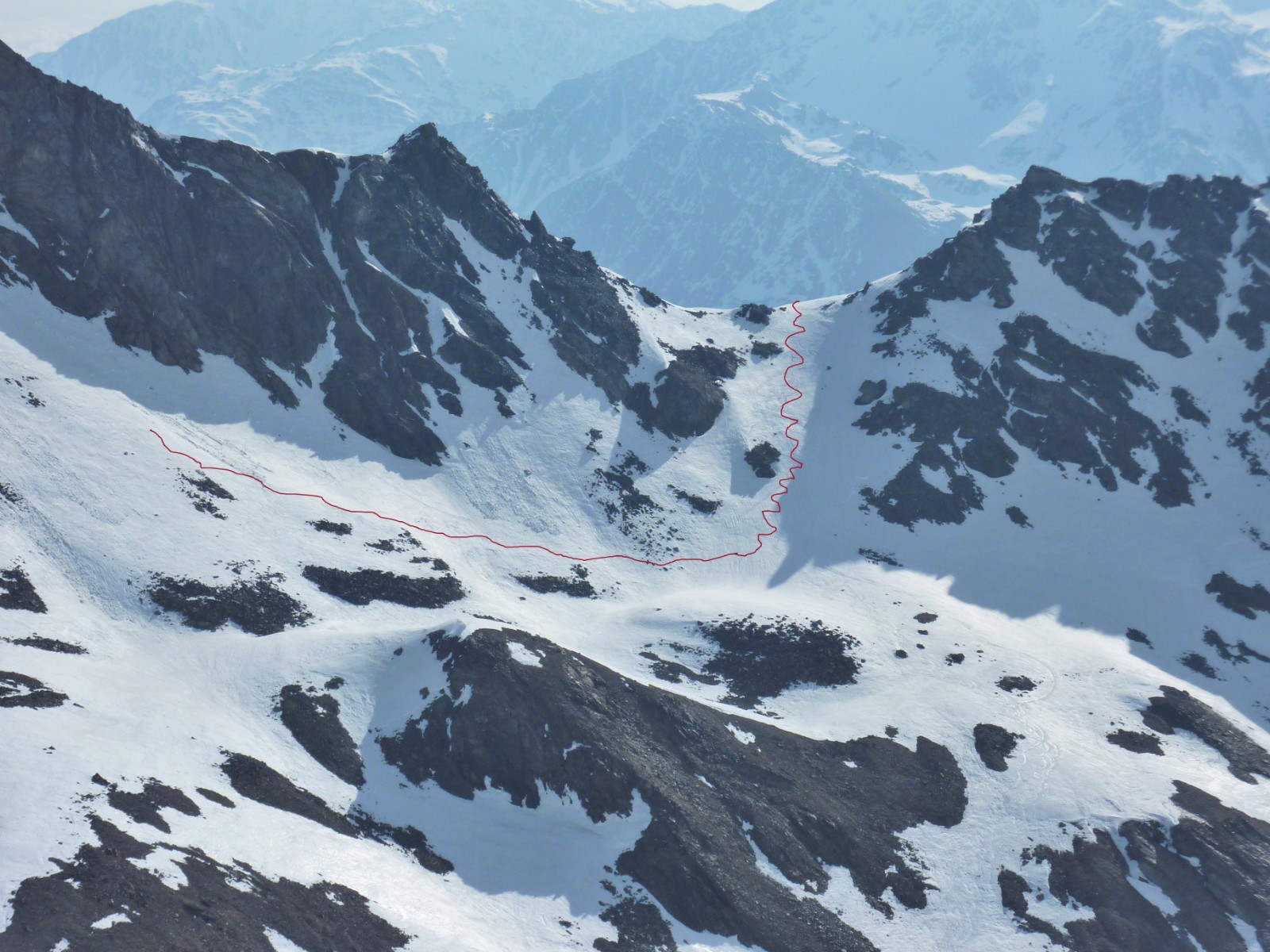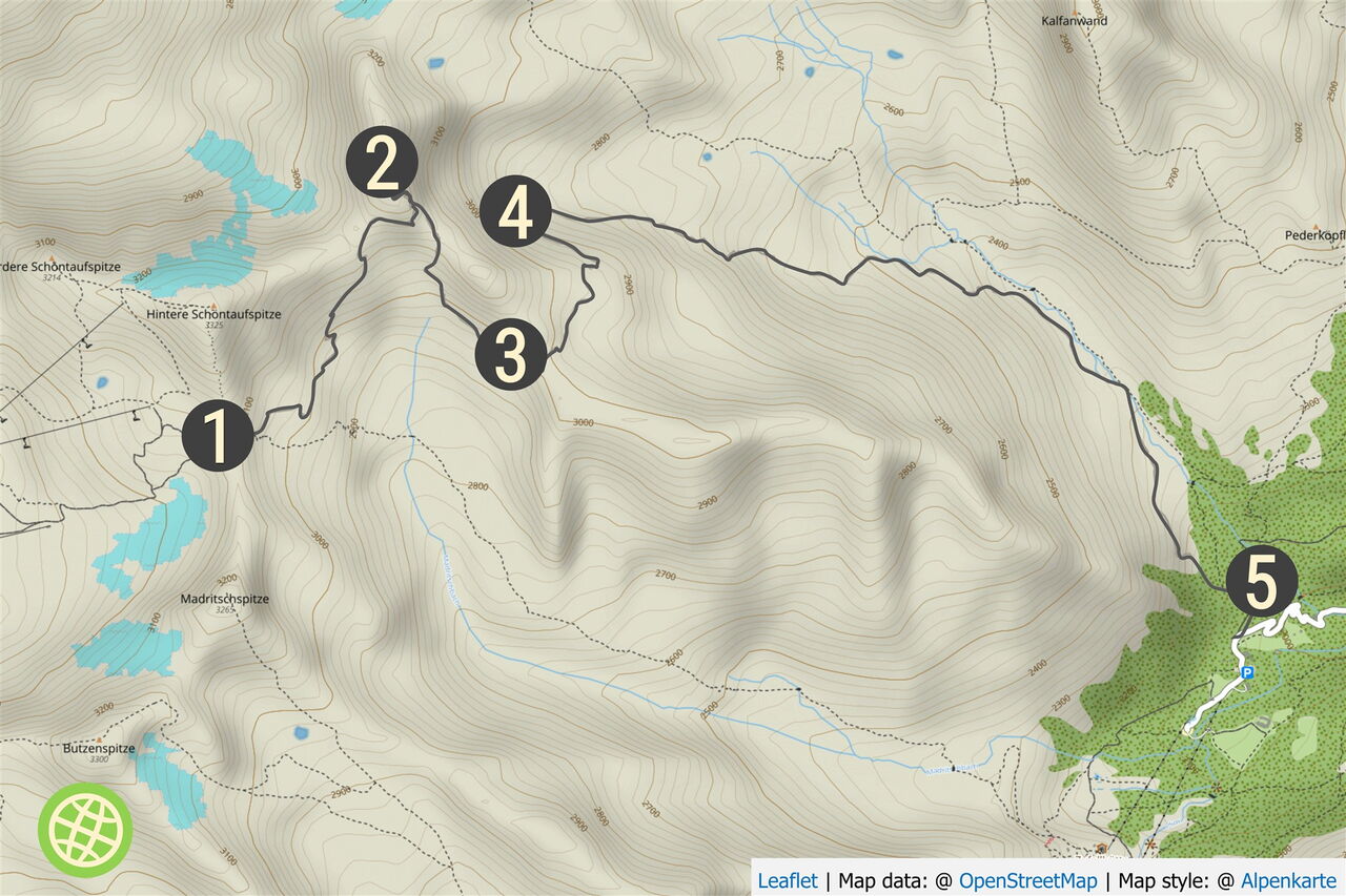 Wir fahren noch ca. 1 km im Hang querend bergab, bis wir dann stetig, später in spitzen Kehren, direkt auf die Pederspitze gelangen. Nach einer Pause geht es auf der gleichen Strecke bergab.