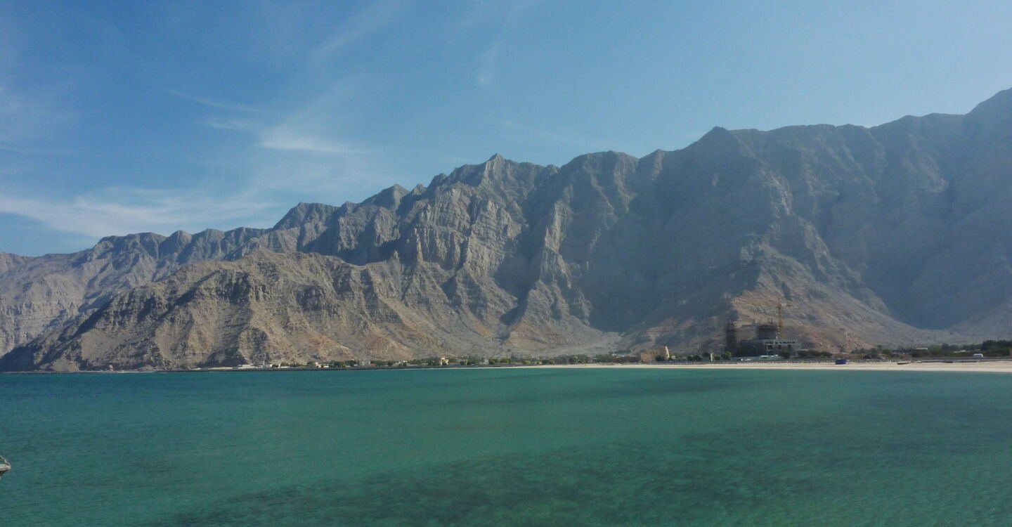 Wir fahren nun auf der neu erbauten Küstenstraße weiter nach Khasab. Sie schlängelt sich durch die karge Landschaft mit den steilen, zum Wasser hin abfallenden Ausläufern vom Hajar-Gebirge.