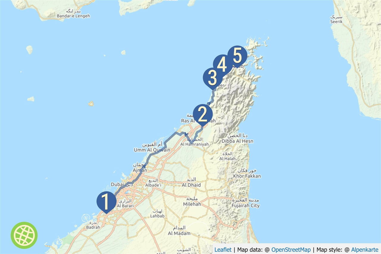 Wir lassen Dubai hinter uns und kommen schon nach einer Stunde Autofahrt an vielen Urlaubsorten im kleinen Emirat Ras Al Khaimah mit seiner gleichnamigen Hauptstadt vorbei.