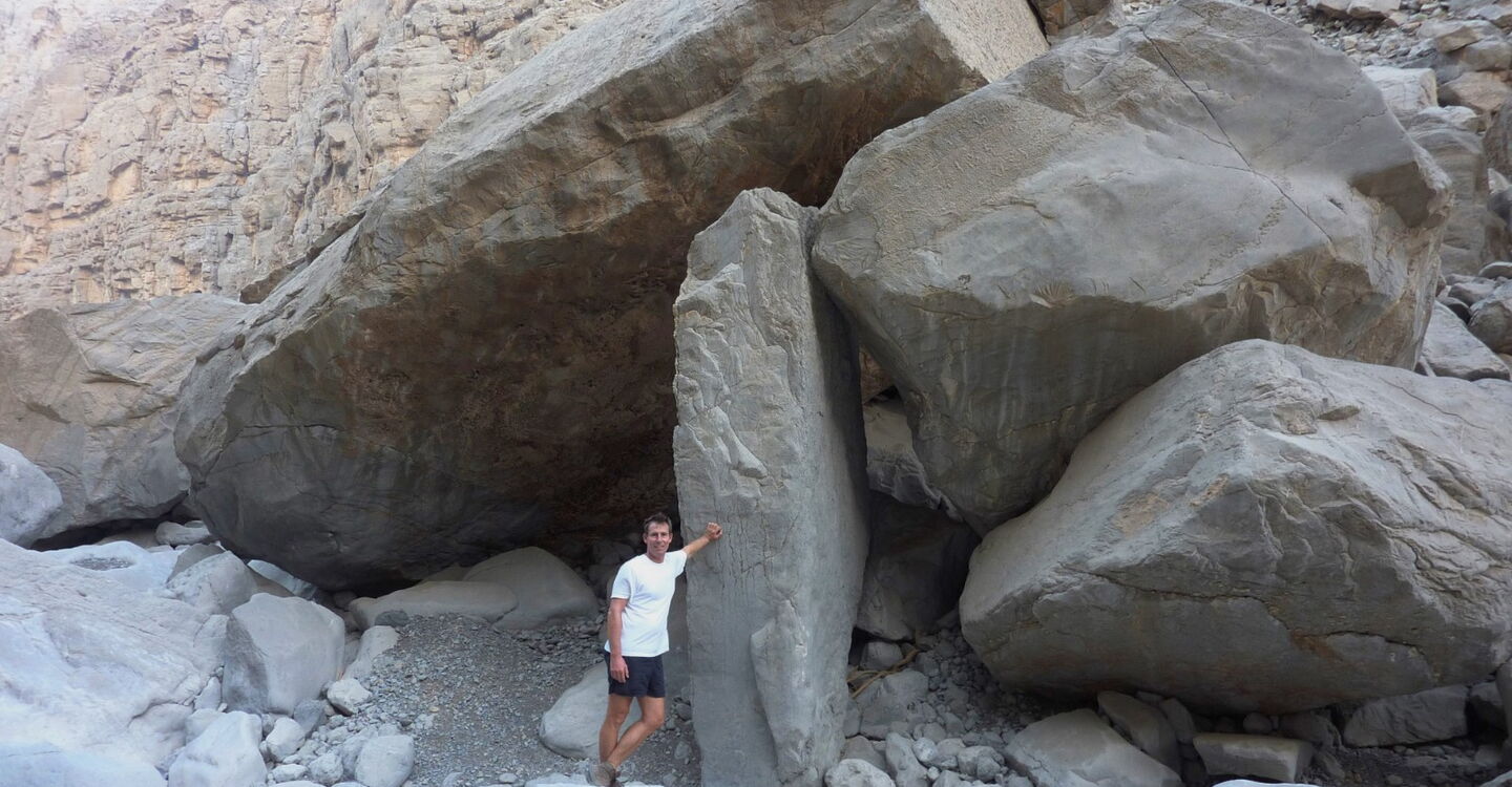 Wir gehen auf einem Pfad ins Wadi Qadah hinein. Die Wände der umliegenden Berge fallen hier bis zu 400 hm senkrecht ab, und der Pfad ist gesäumt mit riesigen Steinblöcken.
