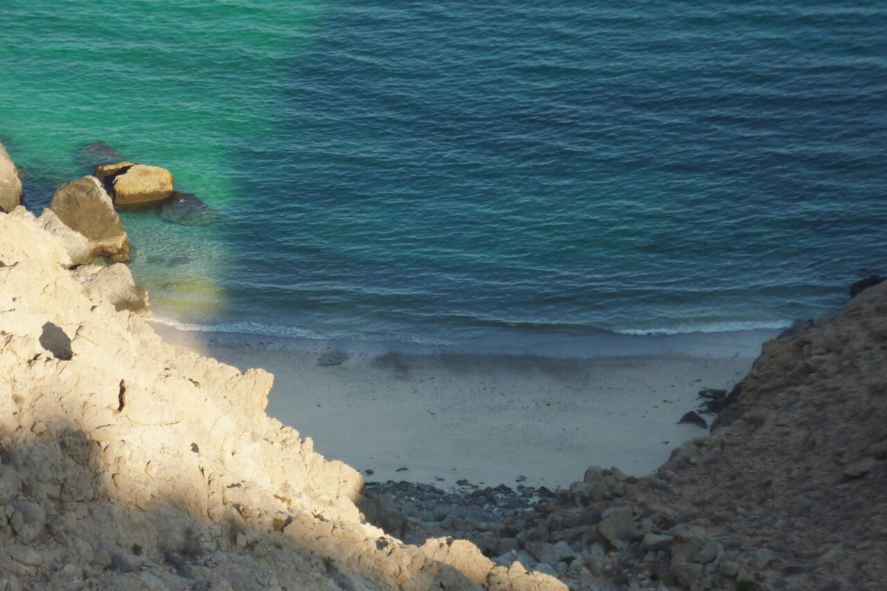 Die Wasserscheide überqueren wir und gehen fortan talwärts, bis wir nach ca. 350 m an den kleinen, aber feinen Strand gelangen.