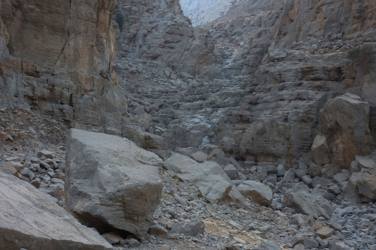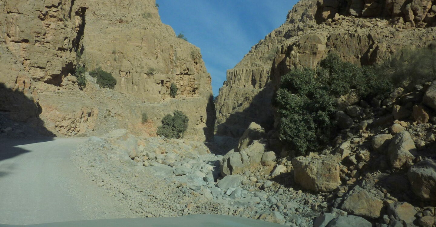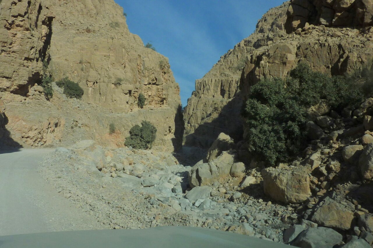 An der engsten Stelle ist das Trockenflussbett, welches in diesem Falle gleichzeitig die Straße ist, nur 5 bis 7 m breit, und die Felswände gehen 300 bis 400 m senkrecht in die Höhe.