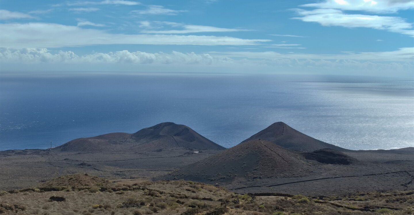 Nach 425 m queren und nach 60 m tangieren wir die Hauptstraße Richtung La Restinga. Nach weiteren 250 m setzen wir den Abstieg auf dem Camino (02) halb links (678 m) fort. Der gemütliche Abstieg führt durch ein Weinanbaugebiet, bis der Weg in eine Schotterpiste übergeht. Wir passieren den rechts von uns liegenden Vulkan, danach öffnet sich ein weiter Blick bis zur Hafenanlage von La Restinga.