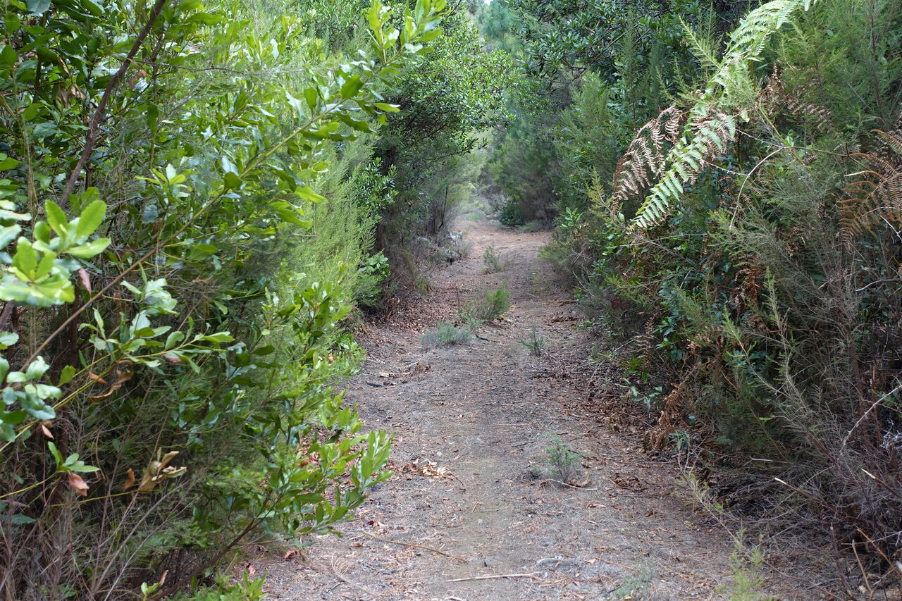 Der Weg endet und wir gehen links 100 m auf der (05) Pista Jaranita (1143 m) bergauf, um dann halb rechts auf dem Pfad den Abstieg fortzusetzen. Auf einem schmalen Steig geht es durch den Wald bergab, bis wir die enge Kehre der Hauptstraße erreichen, der Ausgangspunkt der Wanderung.