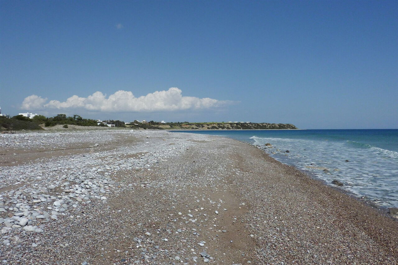 Hier unterqueren wir die Brücke weglos und gehen nun im Trockenflussbett, bis wir den (05) Strand von Lachania (1 m) erreichen. Es folgt ein astreiner Spaziergang an dem 1,7 km langen Kieselsteinstrand. Sobald wir auf gleicher Höhe mit den Flutlichtern für die Tennisplätze sind, gehen wir auf der bergauf führenden Piste oberhalb der Häuser des Thalasso Spa Resort – aber schon in der Anlage – bis zu unserem geparkten Pkw.