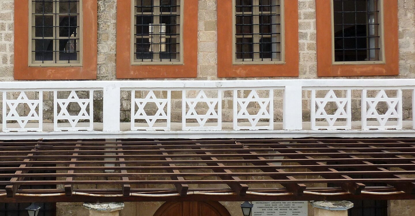 Wir setzen unseren eingeschlagenen Weg fort und gehen nach 60 m, noch vor den 3 Seepferdchen, links in die Einbahnstraße. Wir treffen auf die (02) Kahal-Kadosh-Shalom-Synagoge (11 m) – das älteste jüdische Gotteshaus Griechenlands. Die 1577 erbaute Synagoge bildete das Zentrum des Judenviertels von Rhodos, in dem 1930 etwa 4000 Menschen lebten. Wir gehen auf der Einbahnstraße zurück, links an den Seepferdchen vorbei und treffen auf einen großen Platz mit mächtigen Birkenfeigen. Dort befindet sich ein Gedenkstein an die jüdischen Kriegsopfer von 1944. Wir setzen den Weg weitere 140 m fort, lassen den Brunnen links liegen und gehen in die Einbahnstraße, vorbei an zahllosen Läden, bis rechts der Blick durch das Marientor zum alten Hafen freigegeben wird.