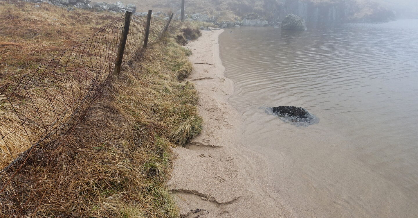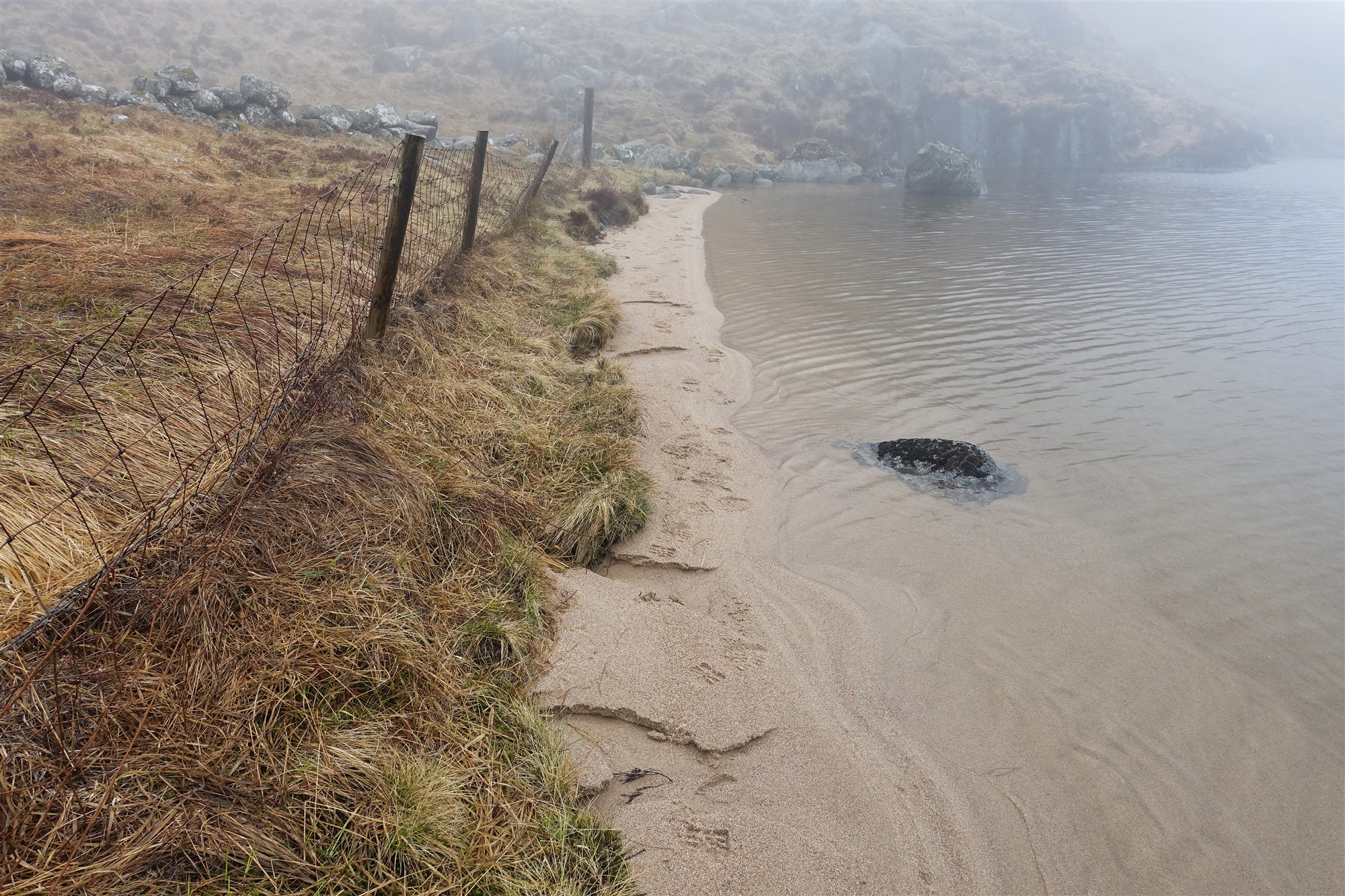 Am nordwestlichen Ufer des Lochs ist der weiterführende Pfad nur schwer auszumachen, hier gehen wir parallel zu einer Steinmauer – diese queren wir im weiteren Verlauf – und einem weiteren Bachlauf. Während wir weiter aufsteigen, passieren wir den 150 m entfernt liegenden Loch Arron an seinem westlichen Ufer. Zwei aufeinanderfolgende Hochebenen queren wir und wandern weiterhin geradeaus. Rechts unterhalb sehen wir nun den 04 Enoch Loch (492 m) – ein unberührter, wunderschöner See. Ein Drahtzaun schlängelt sich bis zur Uferkante des Sees herunter. Wir gehen zwischen dem Zaun und dem kleinen Strandabschnitt am Ufer entlang, um dahinter auf einem gerölligen Pfad parallel zum See aufzusteigen.